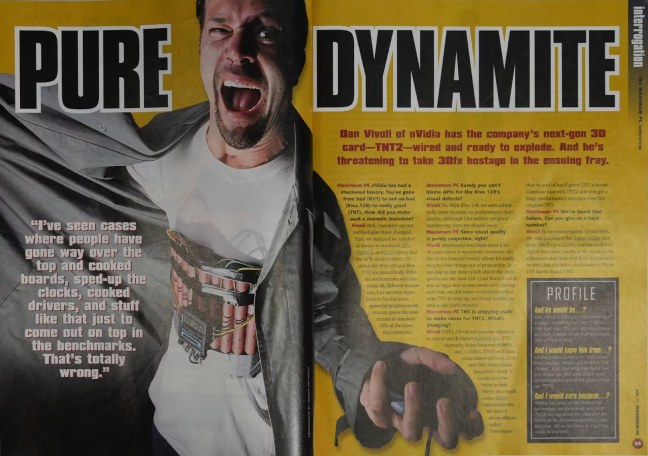 3dfx had its IPO in 1997. There were some minor stumbles that year, like the ill-fated Voodoo Rush as well as leaking the existence of the Dreamcast and torpedoing a potentially profitable contract with SEGA, but things were still trending upwards. 1998's Voodoo2 and Banshee releases marked the peak of 3dfx's success, with IGN reporting (sourced from PC Data) that the top five GPUs sold in 4Q98 were all Voodoo-based. 73% of "performance/gaming graphics'' market share was held by 3dfx by early 1999. That’s almost exactly like NVIDIA's current position, including the market share percentage, and it's a reminder of just how fickle the graphics market is.