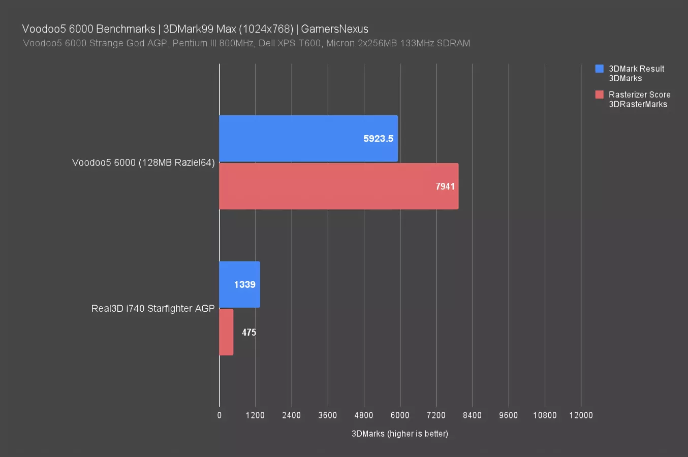 UL hosts free licensed copies of legacy Futuremark suites going all the way back to the original 3DMark99 DirectX 6 benchmark. 3DMark has been a DirectX-only benchmark since its inception, so this test doesn't favor Voodoo as much as the games we selected.