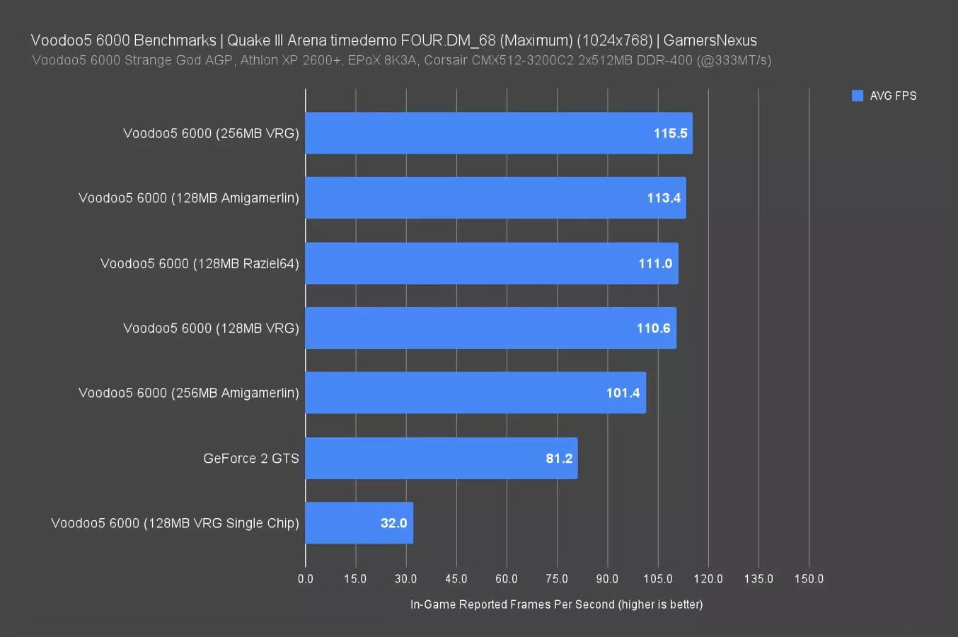 This is normally where we'd tell you why our testing is accurate, but in this instance, we're working with cards and hardware that are outside our direct area of expertise (they predate GN by a decade), and we're working with community-developed drivers and an unofficial service pack for Windows 98. We're also testing software that favors Voodoo: this is a fun showcase, not a competitive review. In every test, performance and stability of the card varied based on drivers and whether Anthony's experimental extra VRAM was enabled. We tried drivers from Amigamerlin (2.9), Raziel64 (1.01.16), and the Voodoo5 6000 Resource Group (1.05.04). Overclocking is supported through the 3dfx tools, but we're not going to push our luck on antique hardware. We did one test pass in "Single Chip" mode, utilizing only one of the four VSA-100s and effectively turning the card into a Voodoo4.