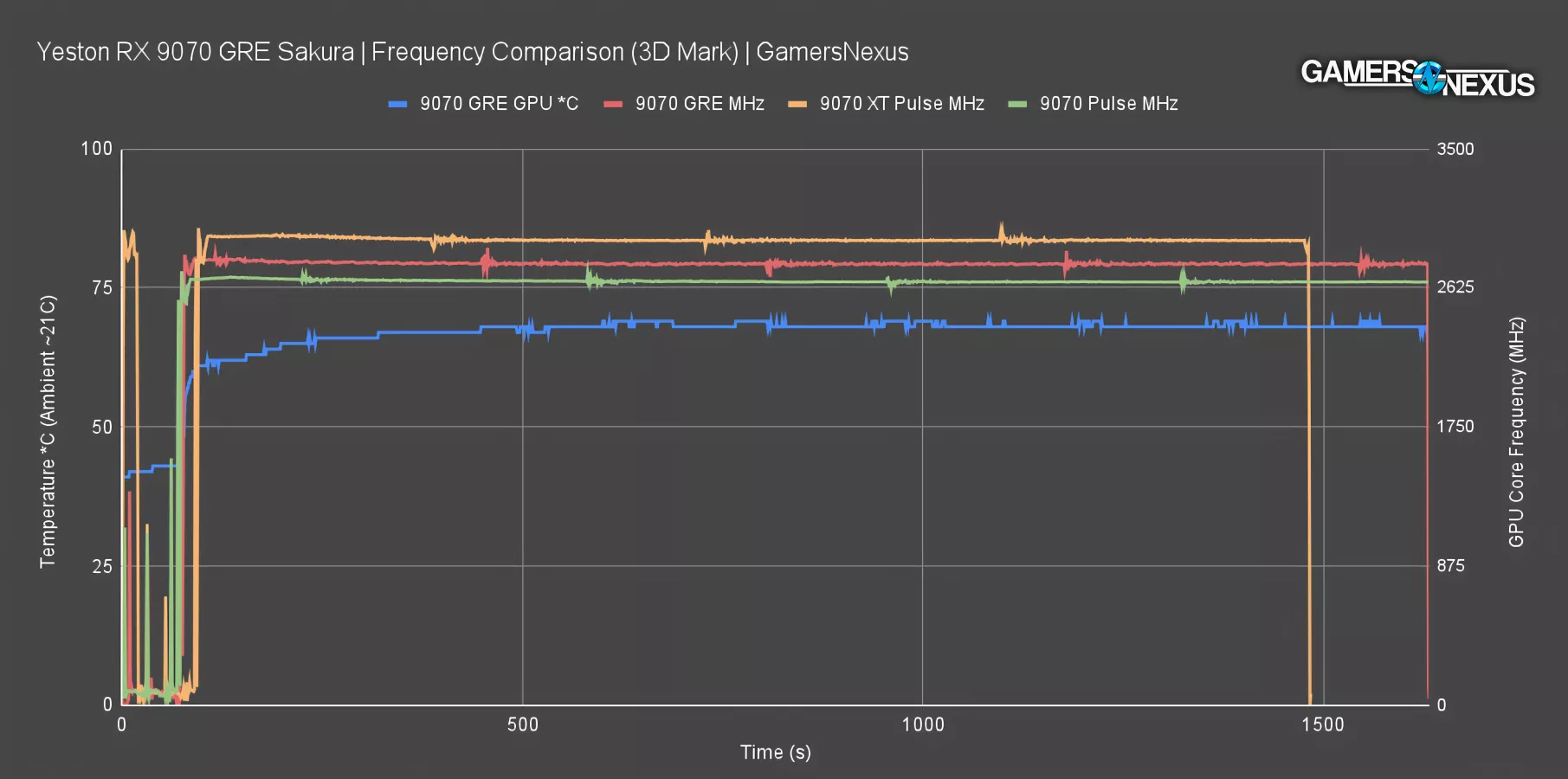 This testing is run with the 9070 GRE at the auto fan speed that it leveled-out at during the earlier thermal testing, so around 1030-1070 RPM.
