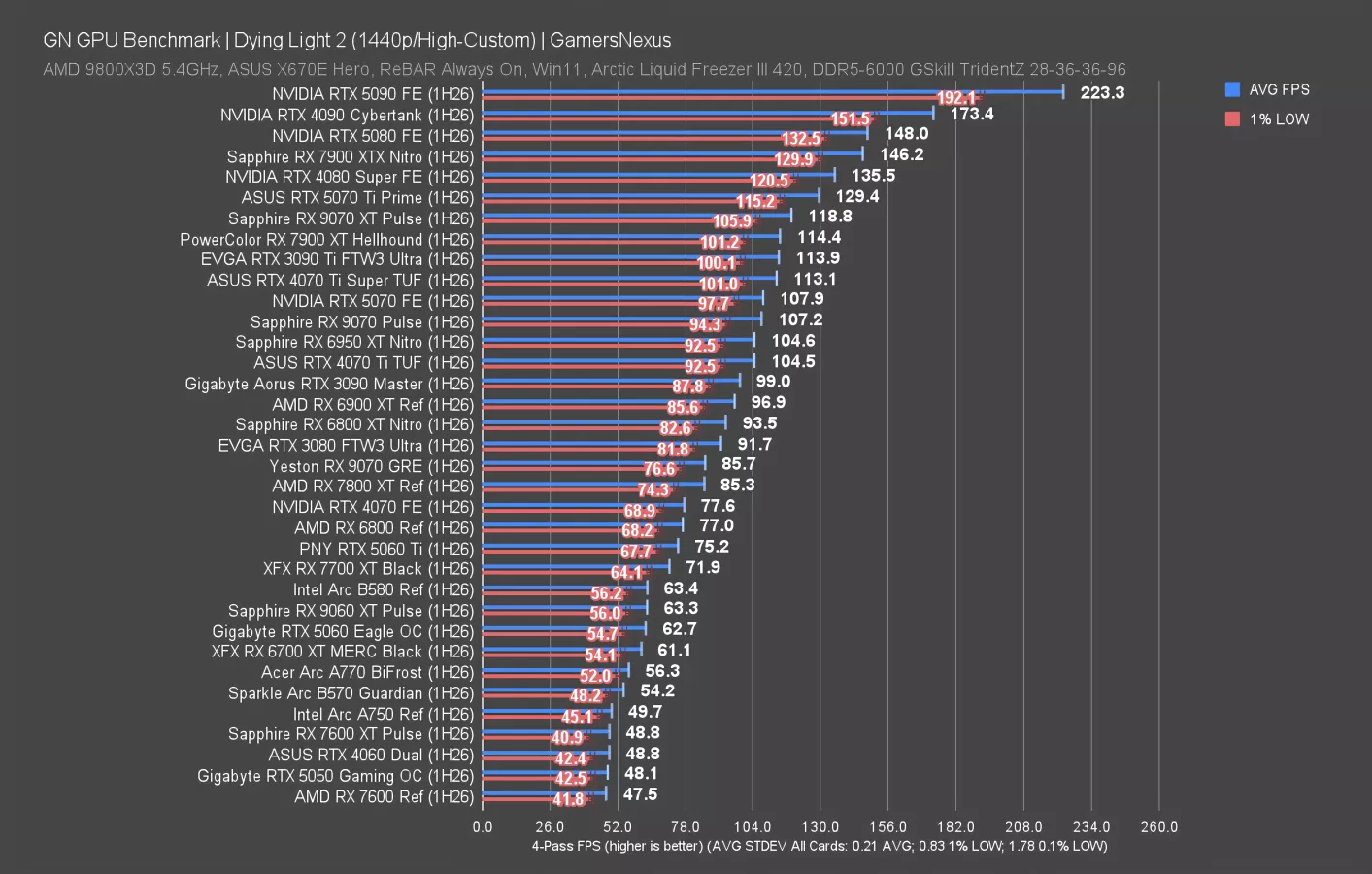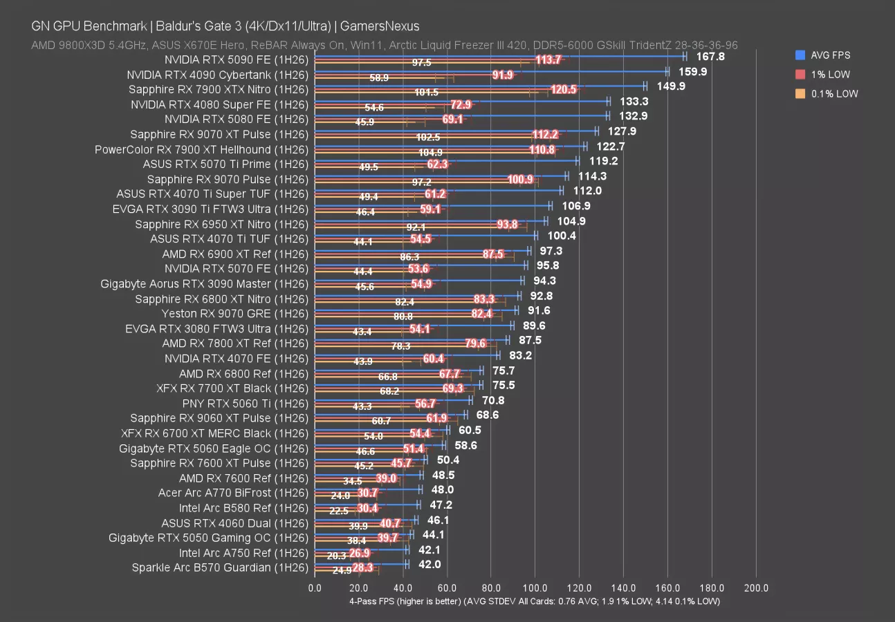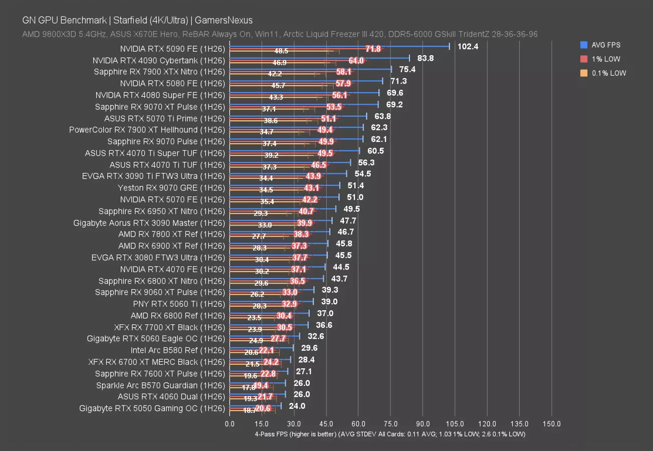 In Starfield at 4K, which is remarkably consistent (not that anyone would ever be playing it to notice), the 9070 GRE ran at 51 FPS AVG and had 1% and 0.1% lows consistent with neighbors. The 5070 ties the 9070 GRE, and actually, the 3090 Ti (watch our review) isn’t far ahead.