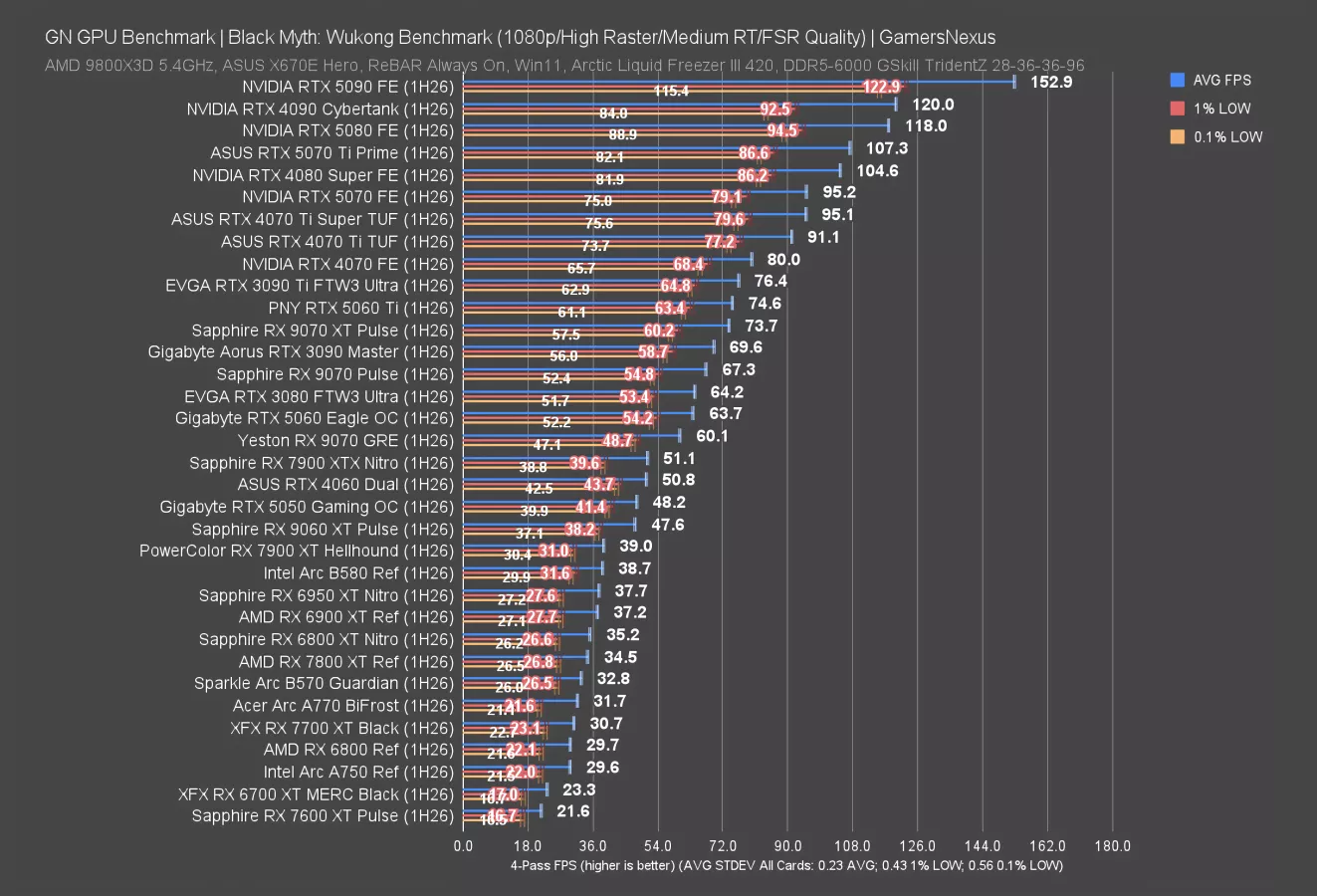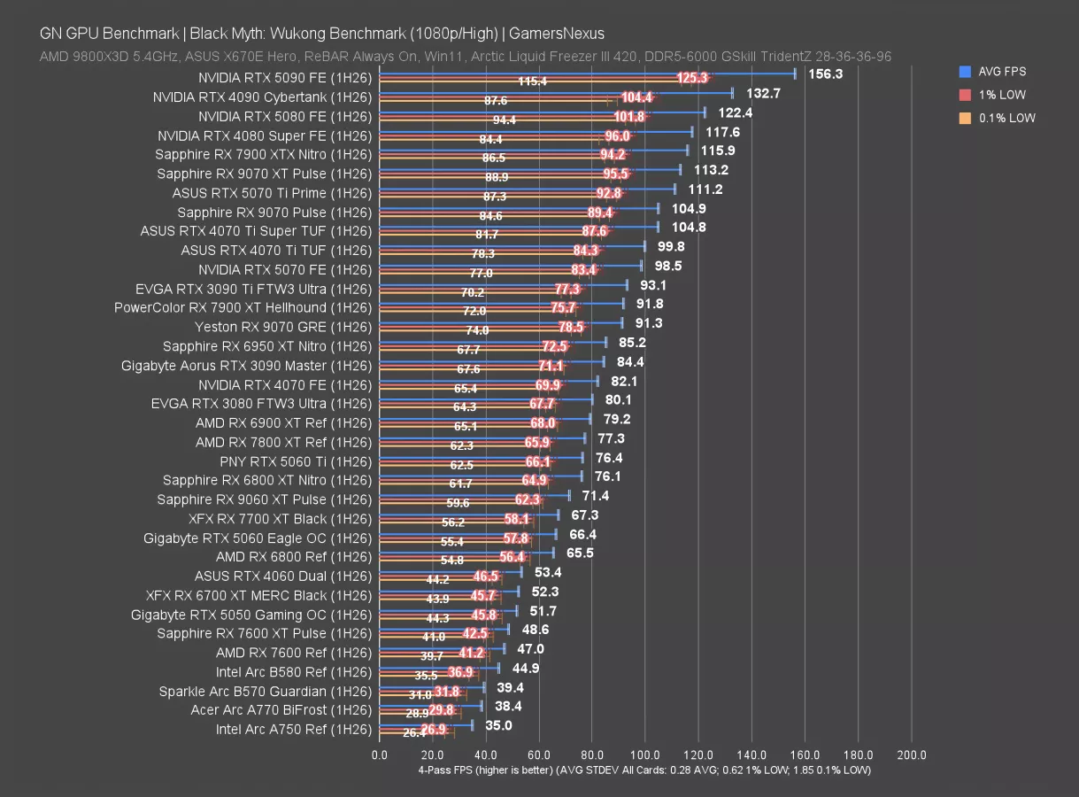 At 1080p, the 9070 GRE is in a playable position at 71 FPS AVG, just behind the 3090 and ahead of the 7900 XT. These are all about the same, including in lows. The 5070 leads the grouping, including a technical but irrelevant victory over the 9070 Pulse. The 5060 Ti gives the GRE about a 14% advantage.