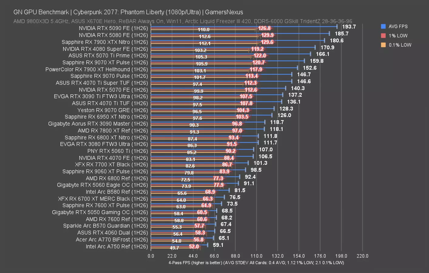 1080p isn’t that interesting, but we’ll show it briefly. The 5070 and 9070 are still about 4 FPS apart from each other. Otherwise, all we’re really seeing is the same scaling as earlier. Let’s move on.