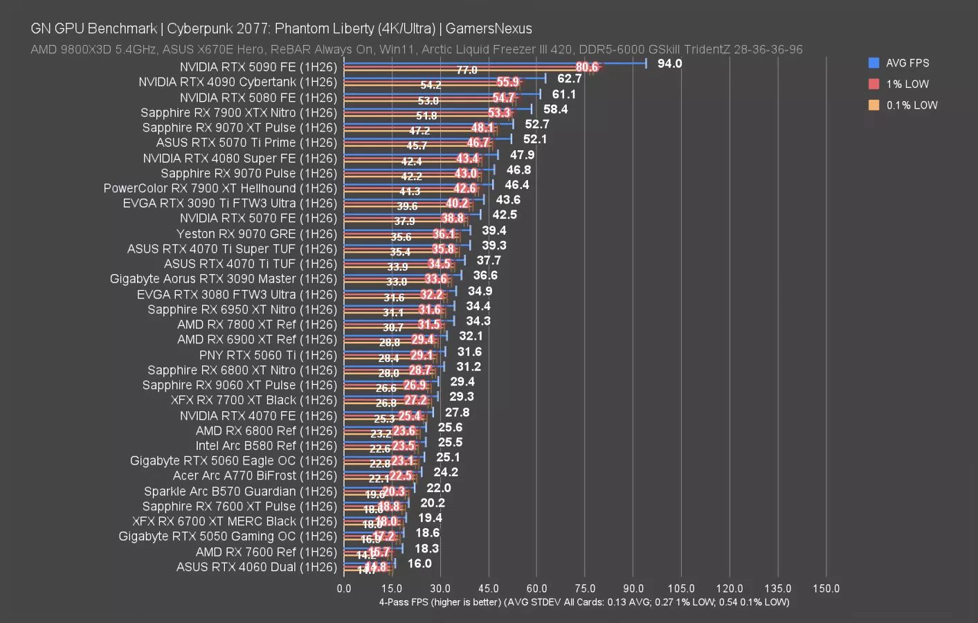 At 1440p, the 9070 GRE held a 79 FPS AVG, equaling the 3090 Ti in all 3 metrics. Obviously, the 3090 Ti’s real value these days is in its 24 GB of VRAM, but in terms of performance, these two are the same today. The 6950 XT is also about the same as the 9070 GRE, with the 5070 technically below it but experientially identical.