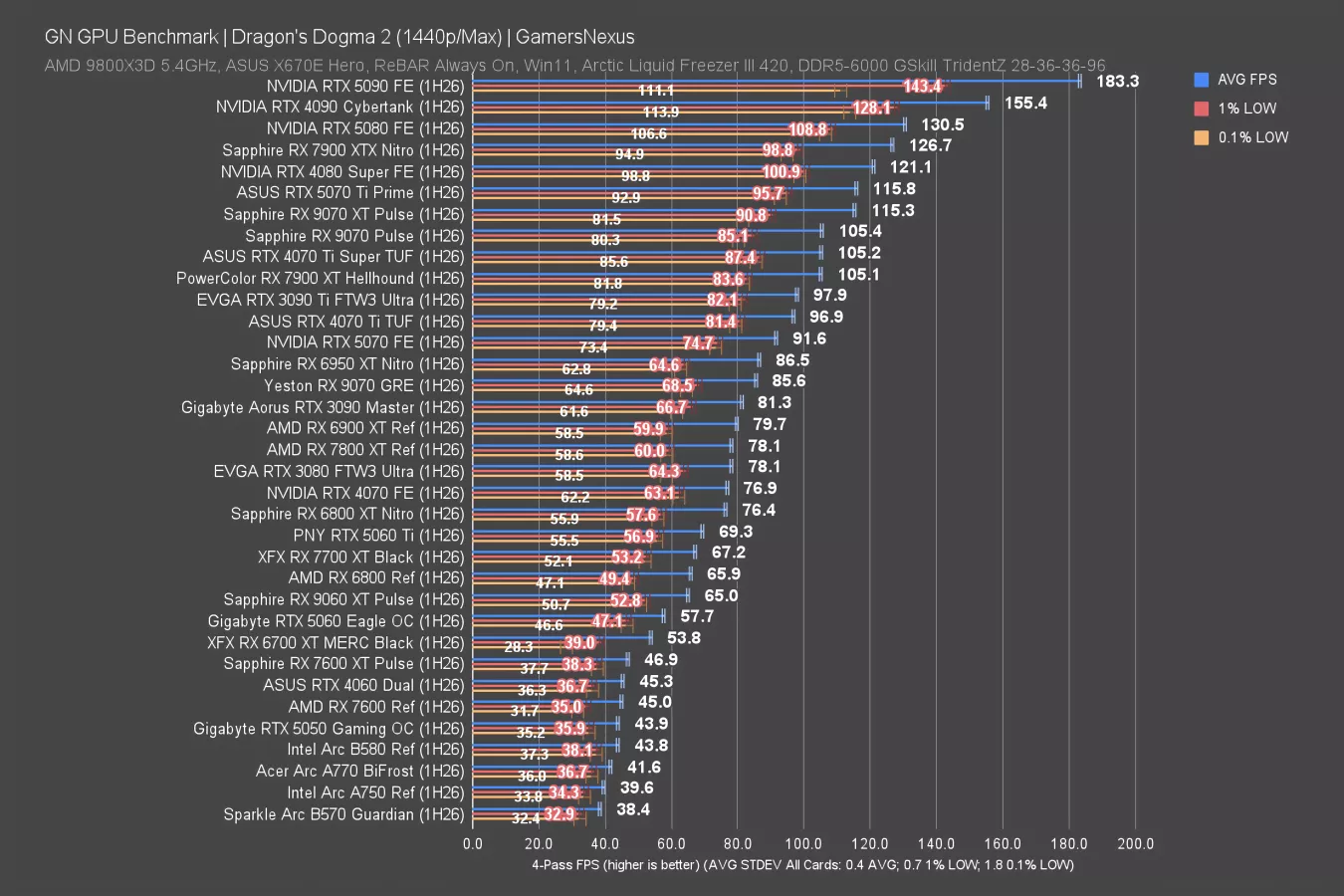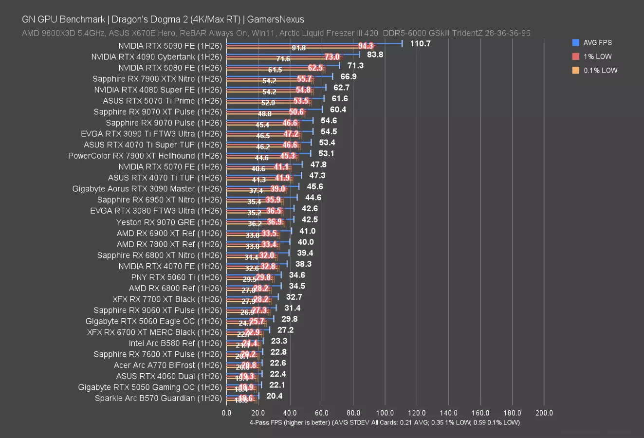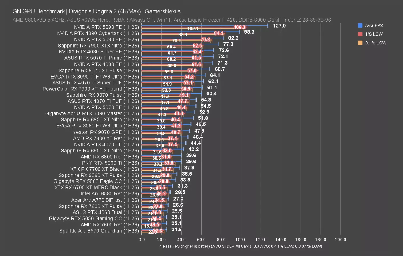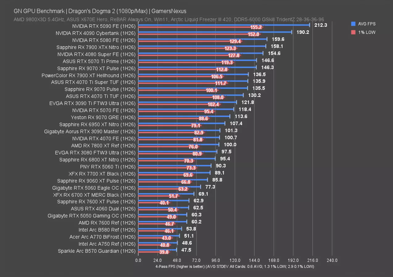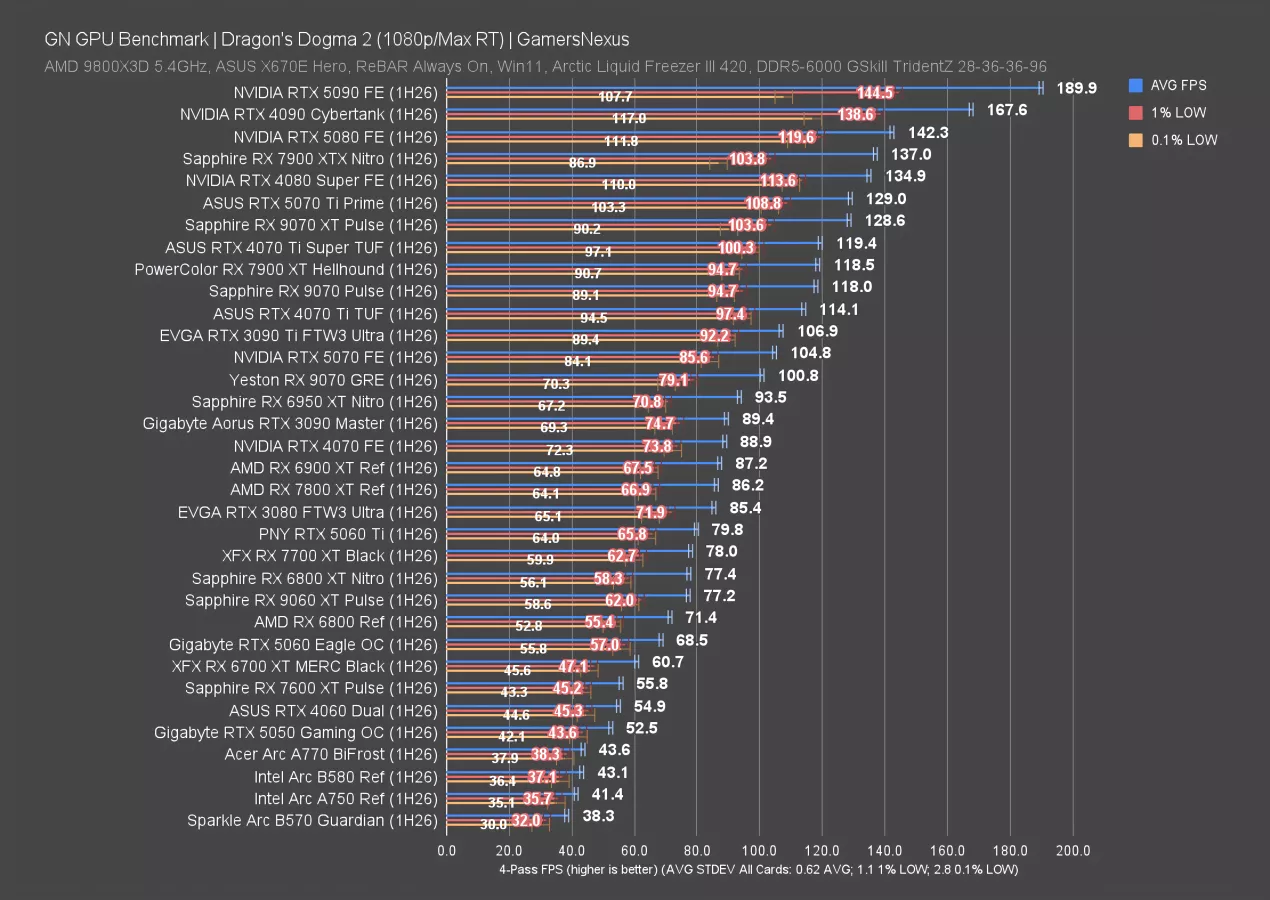 Dragon’s Dogma 2 rasterized is next. This test is load-intensive on the GPUs, especially at 4K, and establishes a wide range of results.