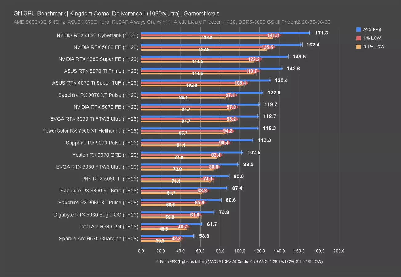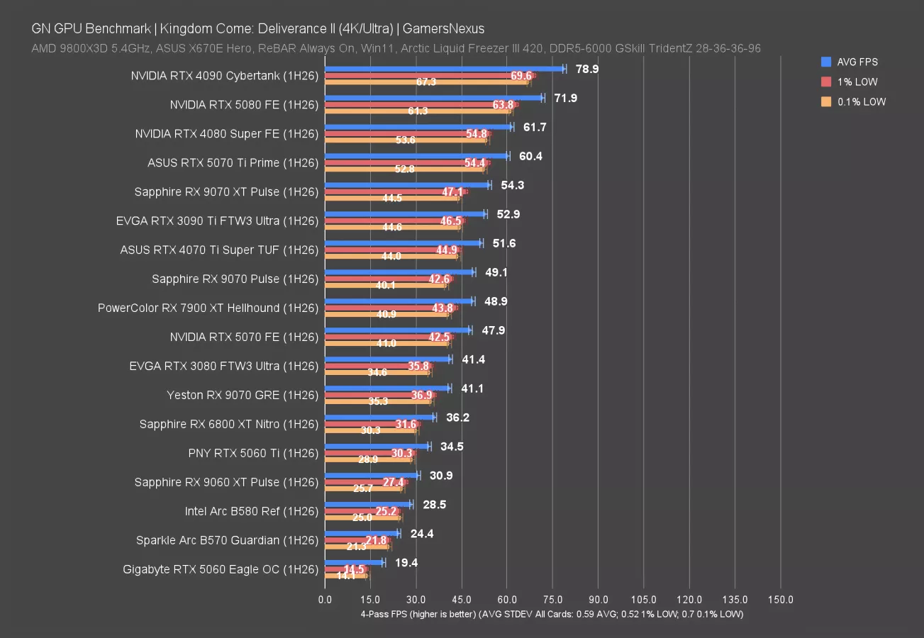 This next one is for Kingdom Come: Deliverance II, which is a new game to our test suite. The game launched in 2025 and is one of the newer titles we’ve added. Because this is brand new, we don’t have as many cards tested. The chart is more barren. On the positive side, this is one of the most consistent games we’re testing now, with the run-to-run variance often impressively below a 1 FPS change. That’s remarkably consistent.