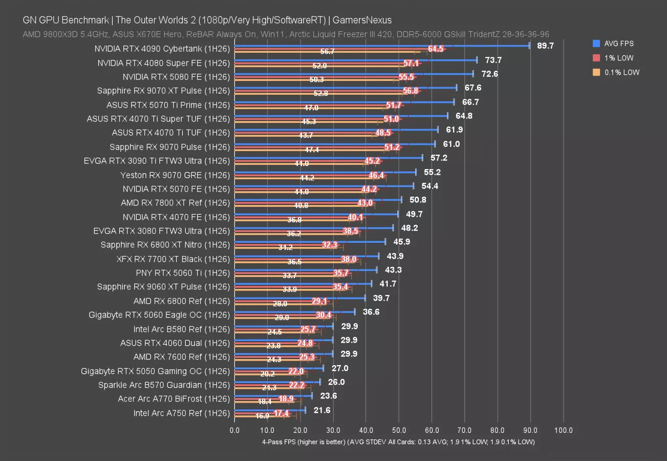 While we’re on games with a more limited data set, we’ll look at The Outer Worlds 2. This is another game we added from the 2025 lineup of releases, and it’s another that has proven overall consistent run-to-run. It’s also intensive with forced RT. We’re using software RT to maximize compatibility and comparability.