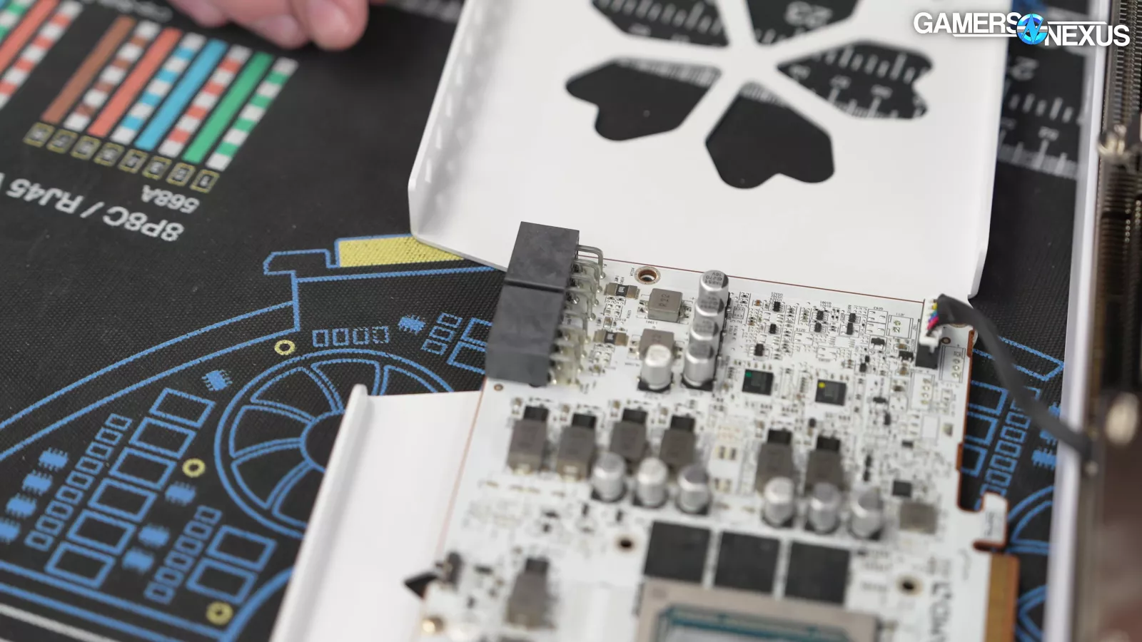 The thermal pad placement is good. They’re all making good contact. One of the thermal pads is oversized, but we’re not seeing any noteworthy faults overall. It’s a pretty straightforward card.
