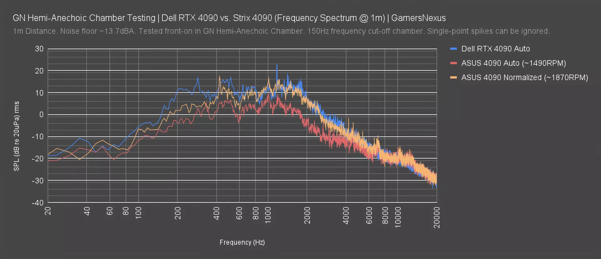 Finally, a roughly noise-normalized dBA SPL Strix at 1870RPM followed a similar frequency spectrum to the Dell 4090. The Dell card had higher levels at 200-400Hz, but otherwise, they’re very similar noise profiles.