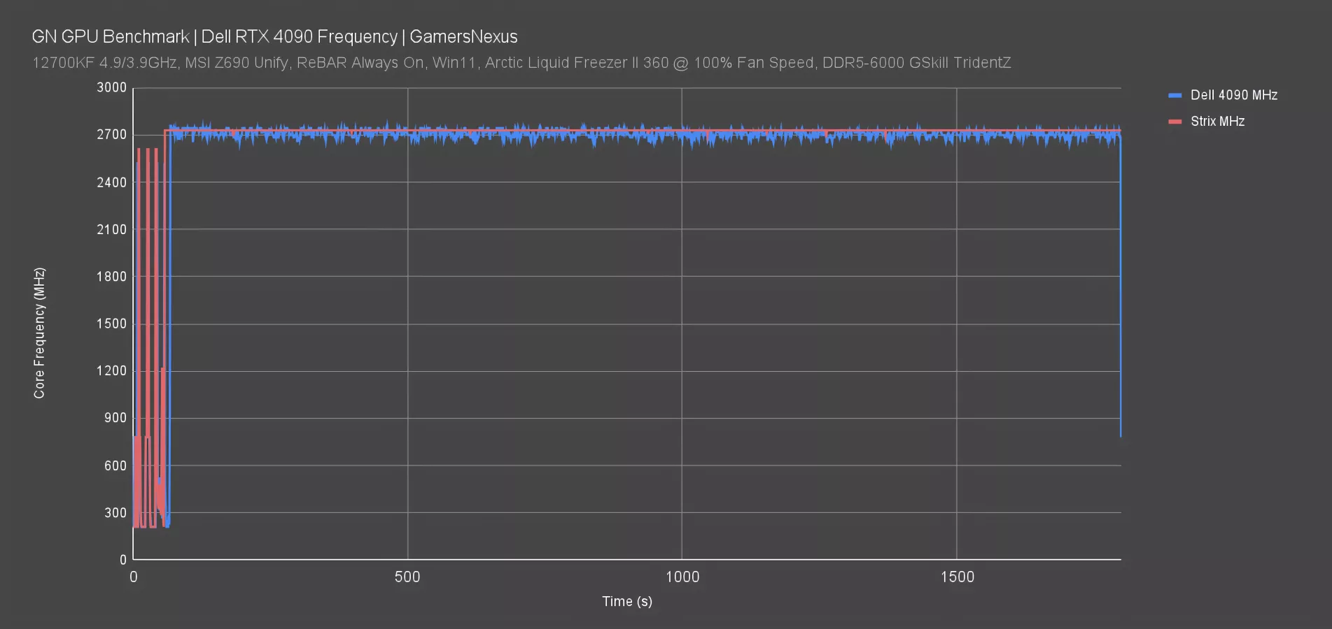 Adding the Strix to the plot demonstrates that: It’s at a flat 2730MHz, whereas the Dell card ranges from 2650 to about 2745MHz. Dell is hitting a power perfcap limit, whereas the Strix is hitting a voltage reliability limit. To flatten this frequency and boost higher, Dell would need to allow VBIOS to pull more power. We could do that ourselves, but it’s locked to 100% in OC software.