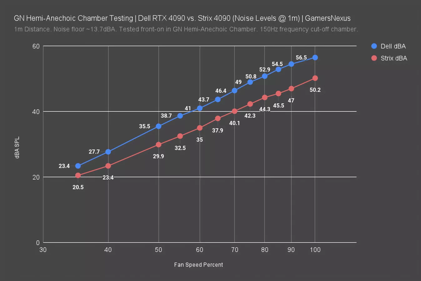 The Dell card runs a higher RPM at a given percent and has less overall range, so its noise level is higher per percentage increase. Like-for-like RPM, they are often within 1dBA of each other -- but the Strix is favored for cooling, as we saw earlier.