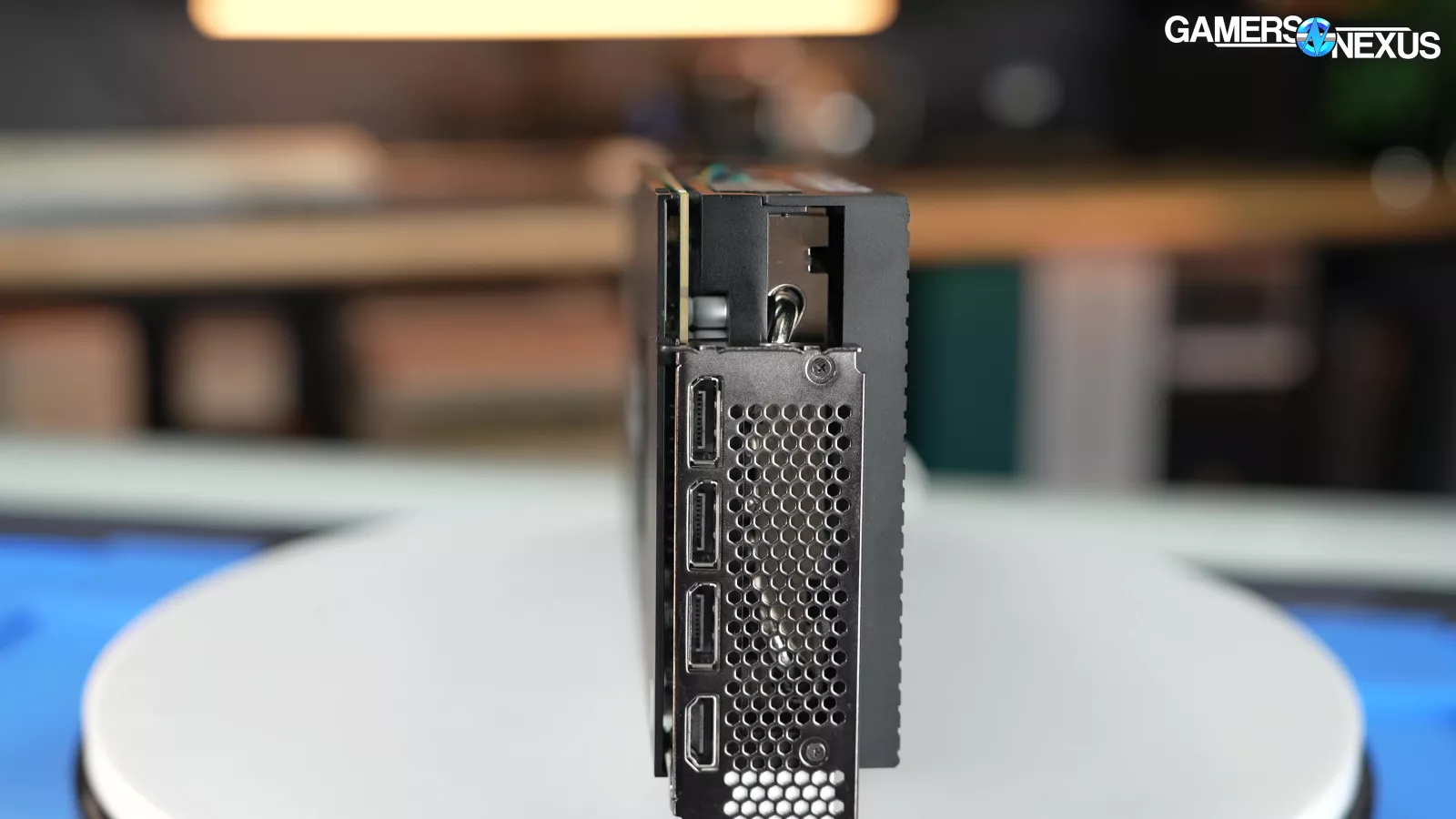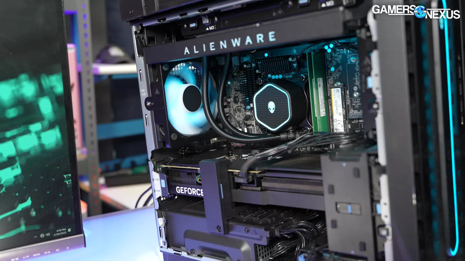 Again, this card came from our Alienware R15, although the same concept would apply to the R16 that we’re working on reviewing now: The card will pull air in through the front intake fan and the lower ventilation in the side panel, then anything passed through the flow-through hole will hit the top exhaust from the CPU cooler. Although this increases the effective ambient of the CPU cooler intake, these larger 240mm liquid coolers are more capable of handling it and the GPU will benefit more than the CPU will lose -- especially given Dell’s clamping-down on power budget.