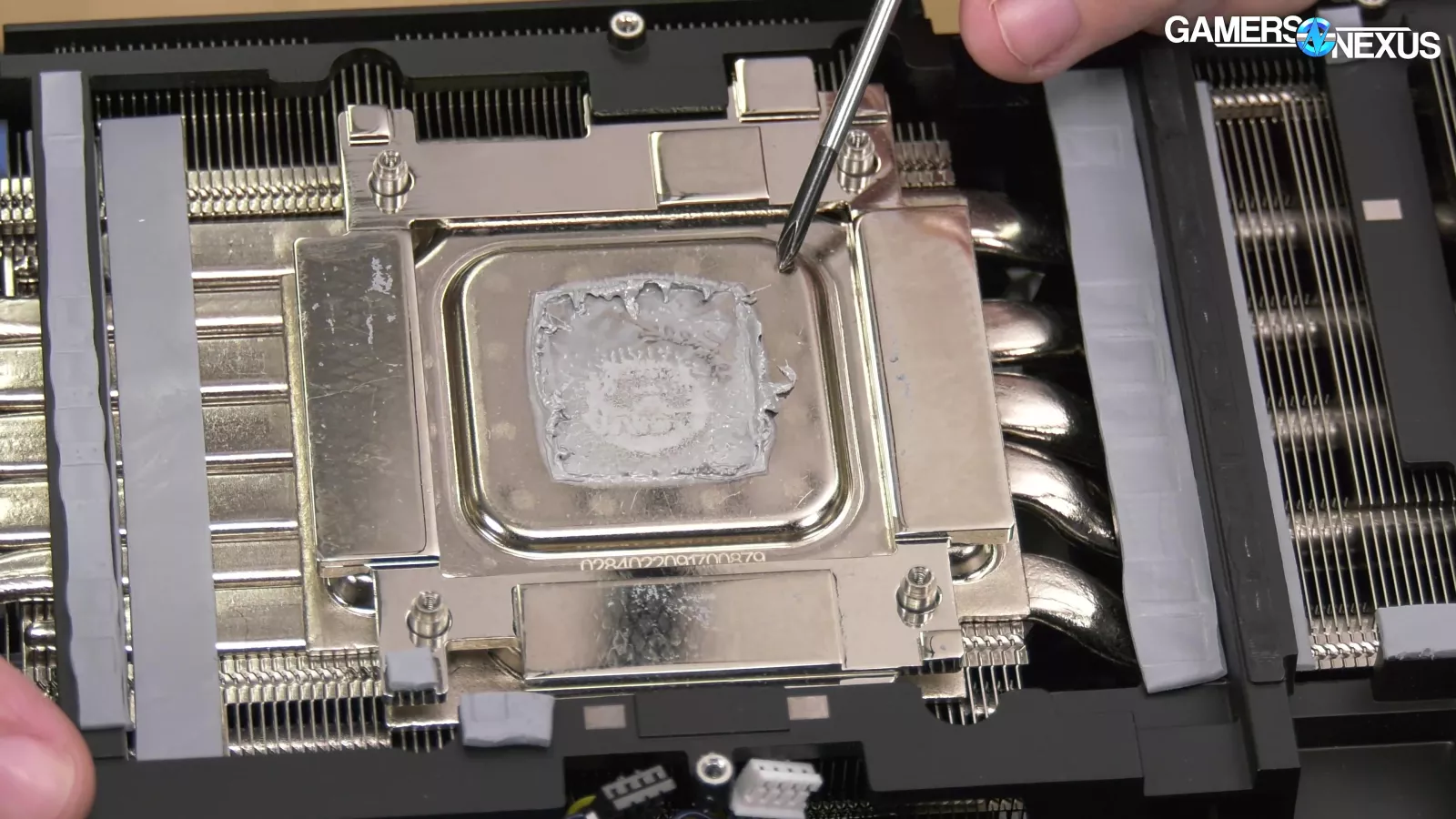 On the PCB, we noticed that there’s room to populate more capacitors, MOSFETs, inductors, and build additional VRM phases. This suggests there is headroom for a more powerful card like a 4090 Ti -- or they just down-costed it. On the GPU itself, we noticed that the thermal paste on it looks spread across in an oddly manual way. Cleaning off the thermal paste reveals the AD102-300-A1 die, which is to be expected for a 4090.