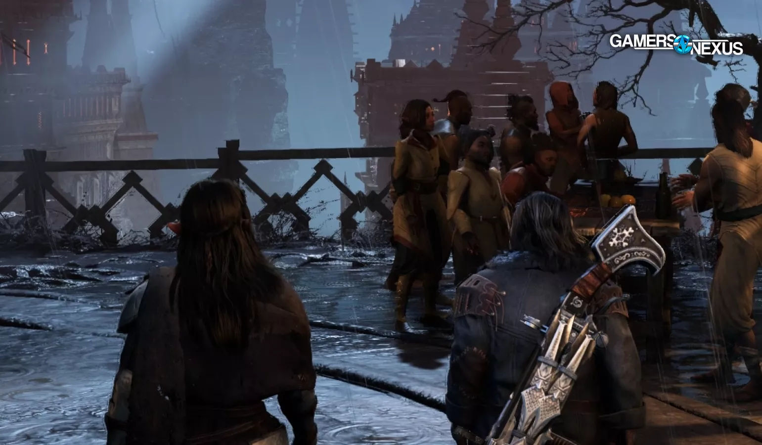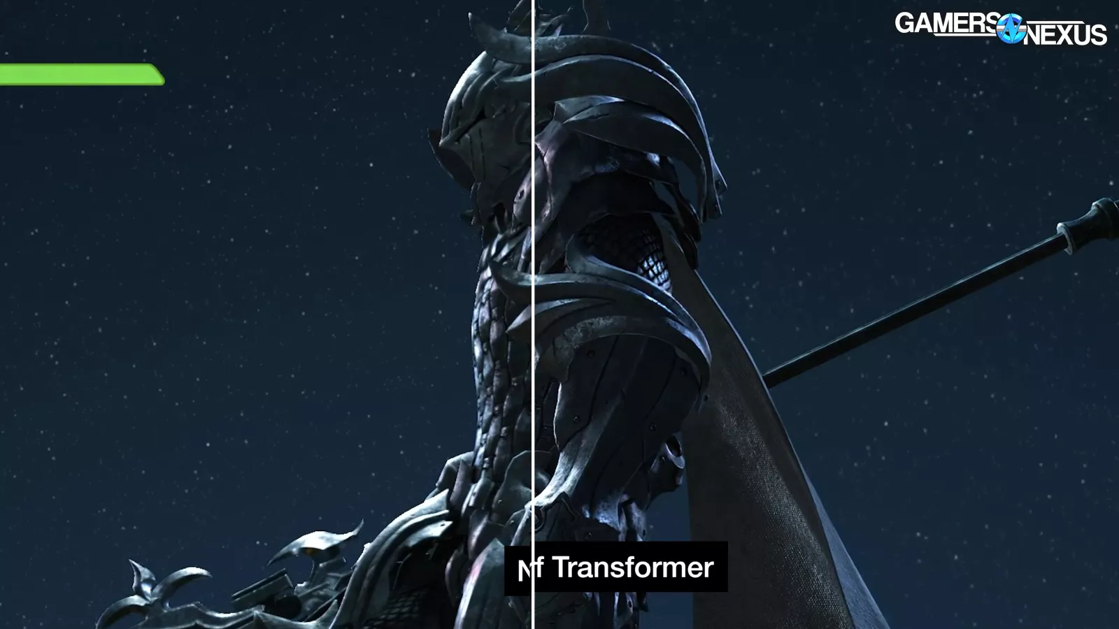 Focusing on the goblin on the rock on the far right shows that, despite the increased clarity, the transformer model is leaving trails behind as it moves. Interestingly, as the goblin jumps off the rock there’s no visible trail or ghosting. This could make sense if motion vectors are part of the equation. NVIDIA says that it uses motion vectors as part of the equation for both frame generation and super resolution.