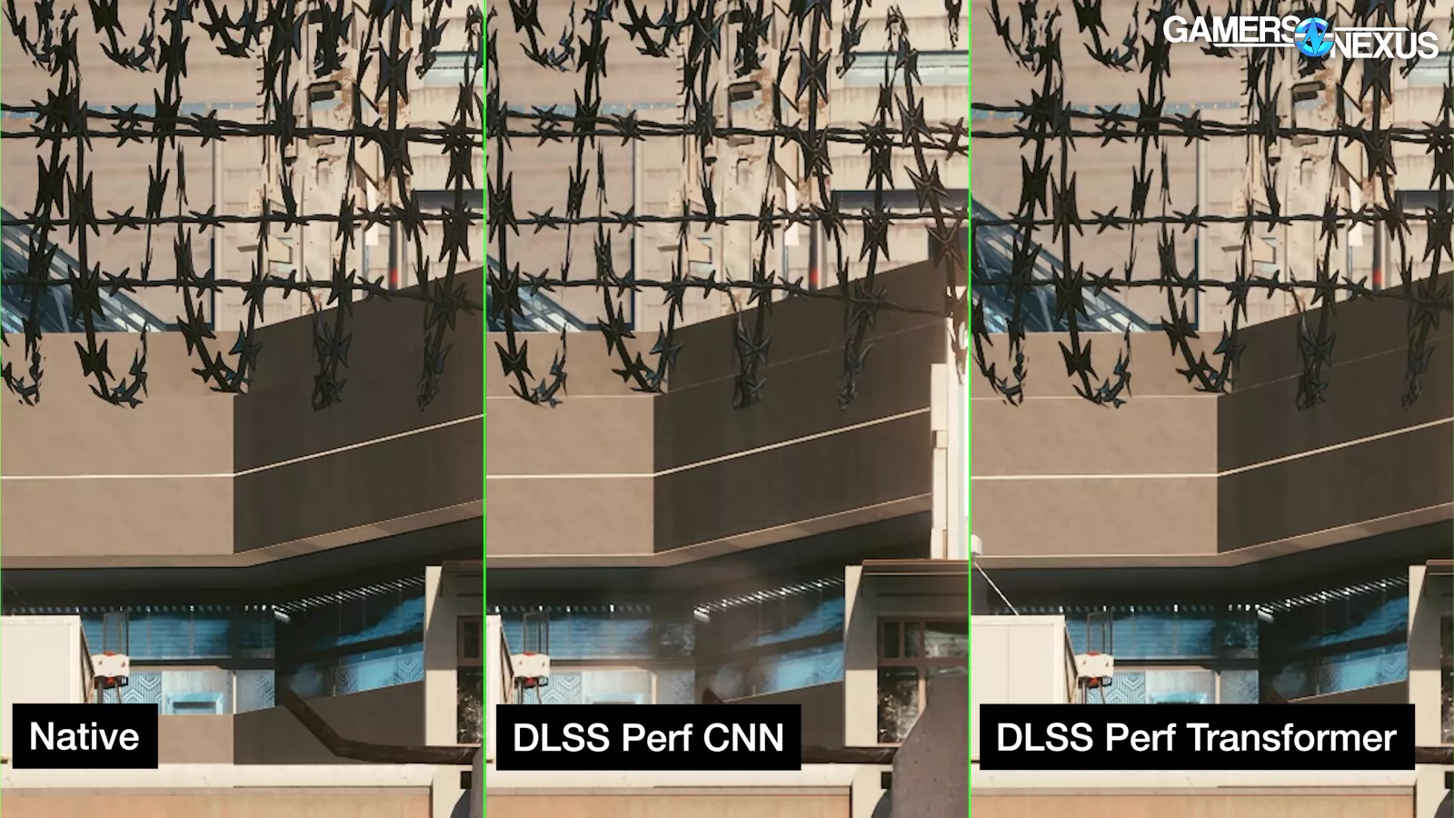 We also saw that thin objects like barbed wire and tree branches sometimes look better with the new model than the older CNN model for DLSS.
