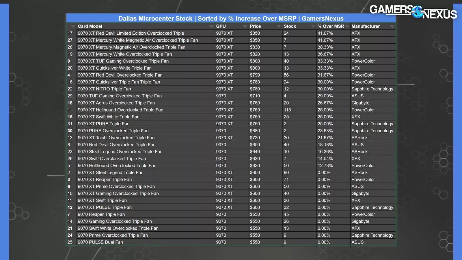 According to this detailed product listing sheet from the Dallas Microcenter, which is the only such one we were able to find, we observed 421 out of 920 cards, or roughly 46%, were sold at MSRP. More specifically, 319 of the 705 9070 XTs and 102 out of 215 9070s were listed with MSRP. This accounts for about 45.25% of 9070 XTs and nearly 47.5% for the non-XTs.