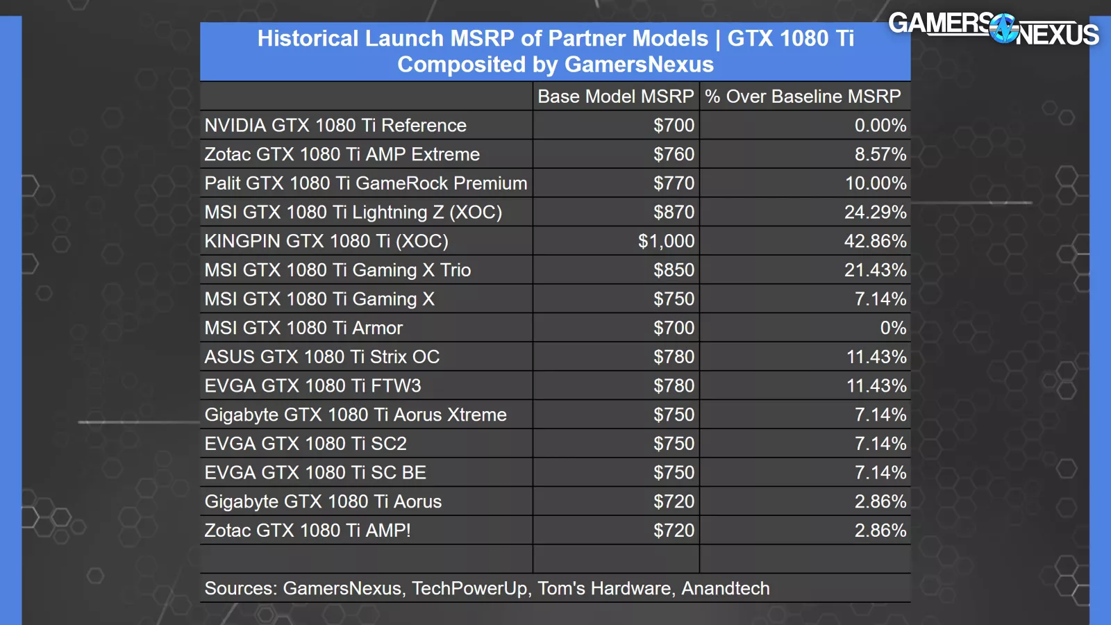 The next highest is the Lightning Z, which was a competing card to the KP and was 24% over MSRP. In fact, most of the cards of that era were about 7% to 10% over MSRP, including some of the best ones. The EVGA 1080 Ti FTW3 (watch our review) and SC2 (watch our review) were both excellent cards. The 1080 Ti Armor (watch our review) was a basic 1080 Ti for MSRP, but could be converted into an excellent water-cooled card with its reference PCB.
