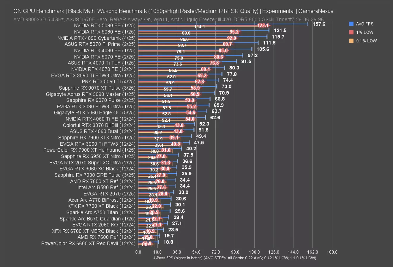 Below the 5060, the A770 and B580 both encroach on its rank at about 85 FPS AVG. Unfortunately for Intel though, frametimes are inconsistent on these cards, as shown in the low variability for the B580 as compared to the A770 and 5060. Arc still has ground to gain here.