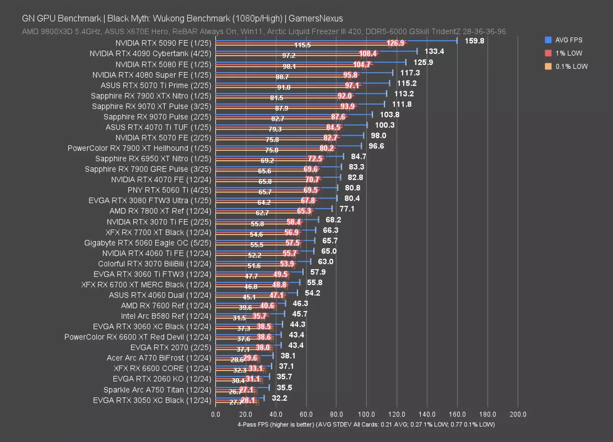 The RTX 5060 ran at 33 FPS AVG in this test. What we care about is the relative comparison: The 5060 is beaten by the 3070 Ti (Watch our review) by 17%. The 5060 Ti is just past that marker at 41 FPS average, leading the 5060 by 25%. The 5070 (read our 5070 review) is next in the hierarchy, up at a 65% improvement. The RX 9070 (read our review) runs at about the level of the 4070 Ti (watch our review), but we’ll have to see where the 9060 XT falls soon.