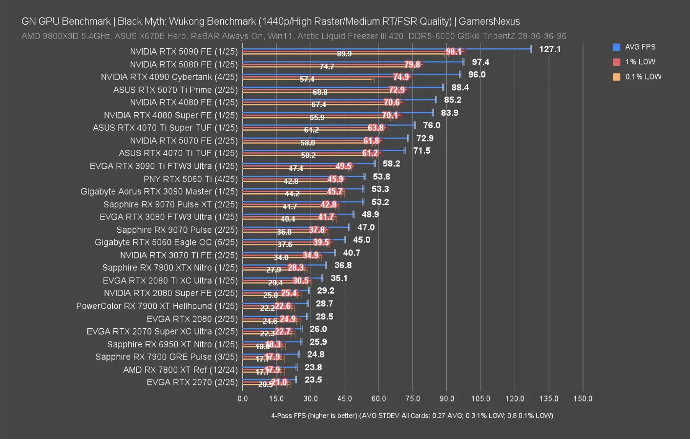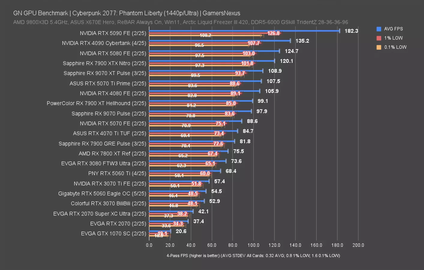 Even more excitingly, the 5060 improves upon the 4060 by 4.1 FPS AVG. That’s such a big improvement that it’s almost noticeable. This 6.6% uplift isn’t something that you can get with just any technology: You have to actively try to produce this little of an improvement. If only we ran all of this through an arbitrary frame multiplier, it’d look more impressive.
