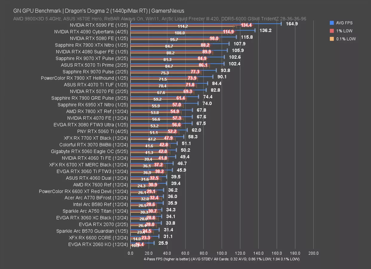Dragon’s Dogma 2 with ray tracing and tested at 4K has the RTX 5060 at just 30 FPS AVG, which we all know humans definitely can’t see faster than, and so this card is basically perfect. Just like Jensen said.