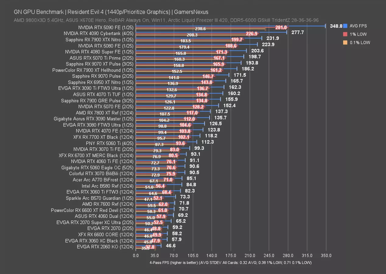 Resident Evil 4 at 4K is up now, this time ray traced and with upscaling. The RTX 5060 ran at 55 FPS AVG, again roughly tying it with a 3070 and 6700 XT. The 5060 Ti is again around 22% better than the 5060 in average FPS here, with lows improved proportionally.