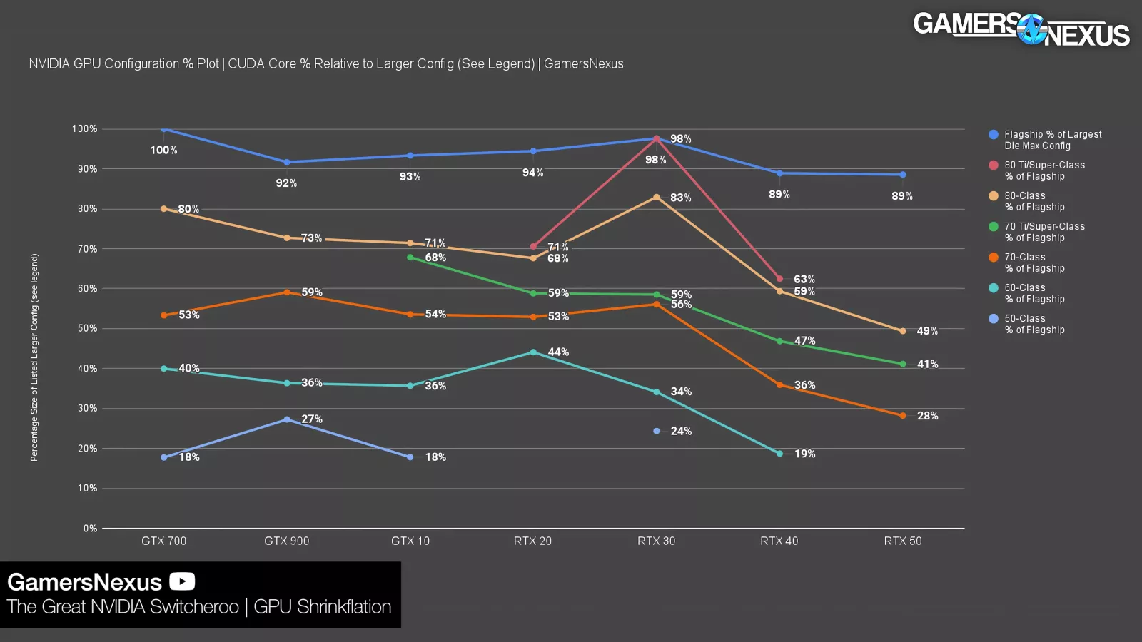 In our story about NVIDIA’s shrinkflation, we made this chart showing how NVIDIA’s modern RTX 4060 is similar to the GTX 750 in CUDA core percent relative to the larger configuration. In fact, its RTX 5070 was similar to an RTX 3050 (watch our review) by this metric. If we were to add the 5060 to this chart, it’d be at 15.6% of the full GB202 configuration and 17.6% of the 5090 (read our review) configuration.