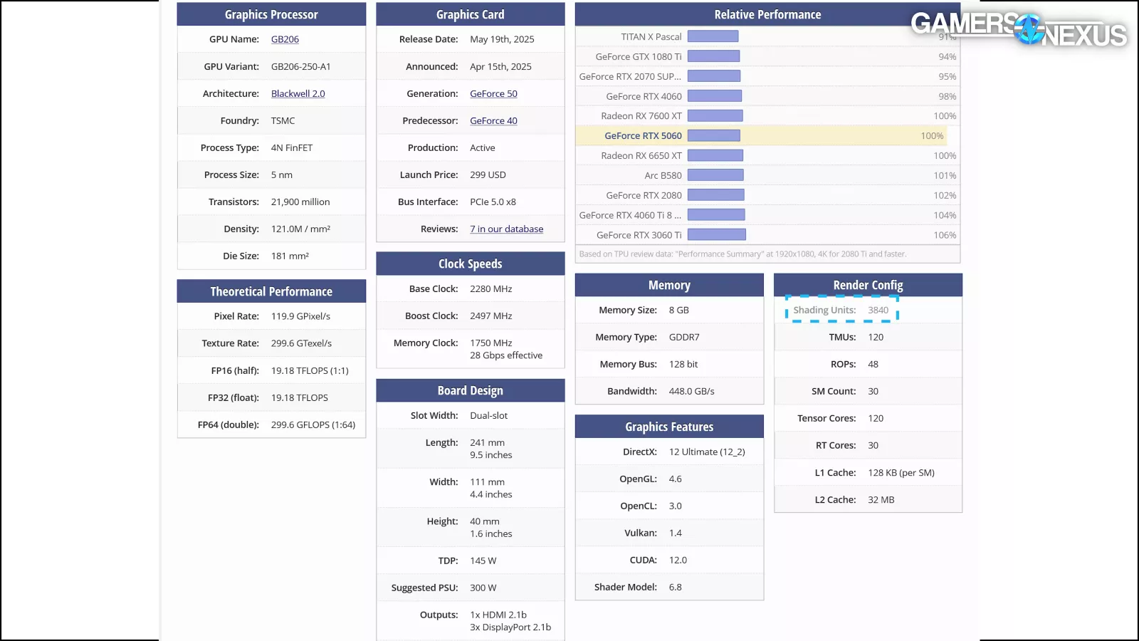 The RTX 5060 has 8GB of GDDR7 memory on an anemic 128-bit bus, 3840 CUDA cores, theoretically 48 ROPs, but who knows if they’re actually there, and uses GB206 for the core. It’s also on a PCIe 5.0 x8 interface, so it’s populating half of the available lanes.