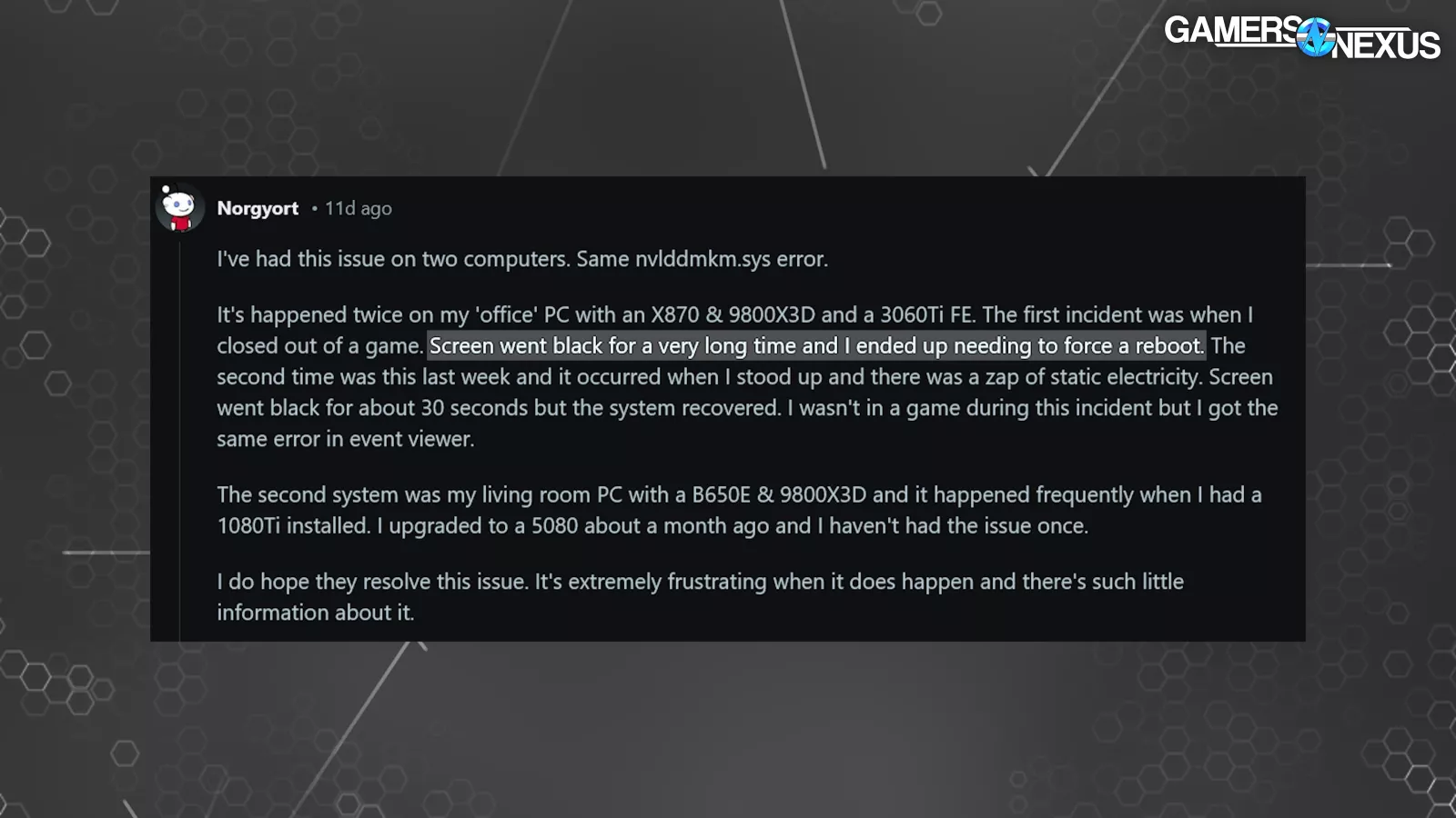 We’ve known that NVIDIA has shifted its focus towards larger business clients and away from its gaming market. That’s fine -- but it shouldn’t be screwing up areas where it has long had such refinement. NVIDIA is known for its driver stability, and the company, in its series of screwups for 2025, is starting to chip away at that in an era where AMD’s drivers have become relatively stable. These driver issues are another mark upon NVIDIA’s tarnished gaming reputation with the 50-series launch as the company shifts focus, but losing prior-gained ground shouldn’t be in the cards, and NVIDIA hopefully will recognize that these issues are damaging to its long-term brand credibility.