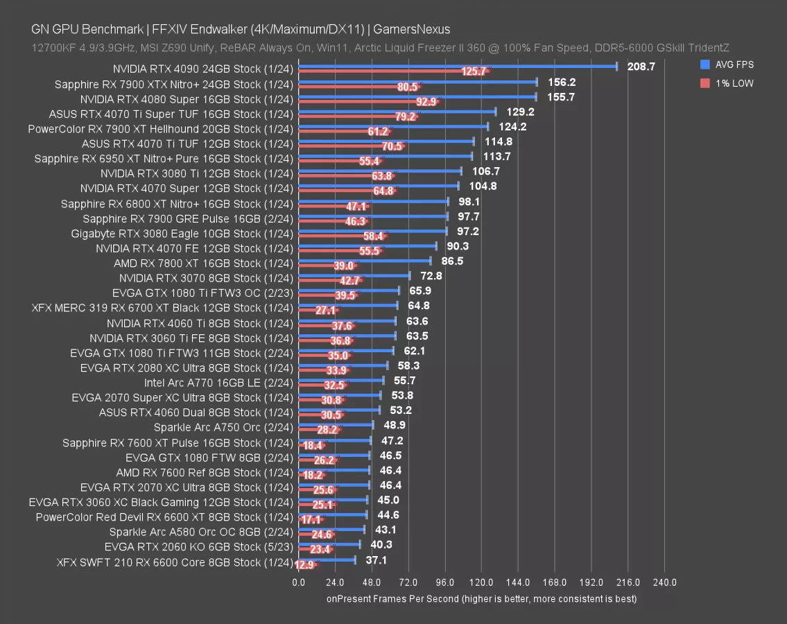 In Final Fantasy 14 at 4K, the GTX 1080 Ti still manages to hold a 62 FPS AVG. No problems here. That has it at 3060 Ti (read our review here) levels of performance and actually surpassing the 2080, somewhat embarrassingly for the Turing card. The 1080 FTW ran at about RX 7600 levels of performance, flanked by the two available models. This chart actually also contains an overclock we ran for the 1080 Ti last year for our revisit (and that data is still valid -- this game’s results don’t change in our test approach). That OC had it up at 6700 XT average FPS, surpassing the 4060 Ti.