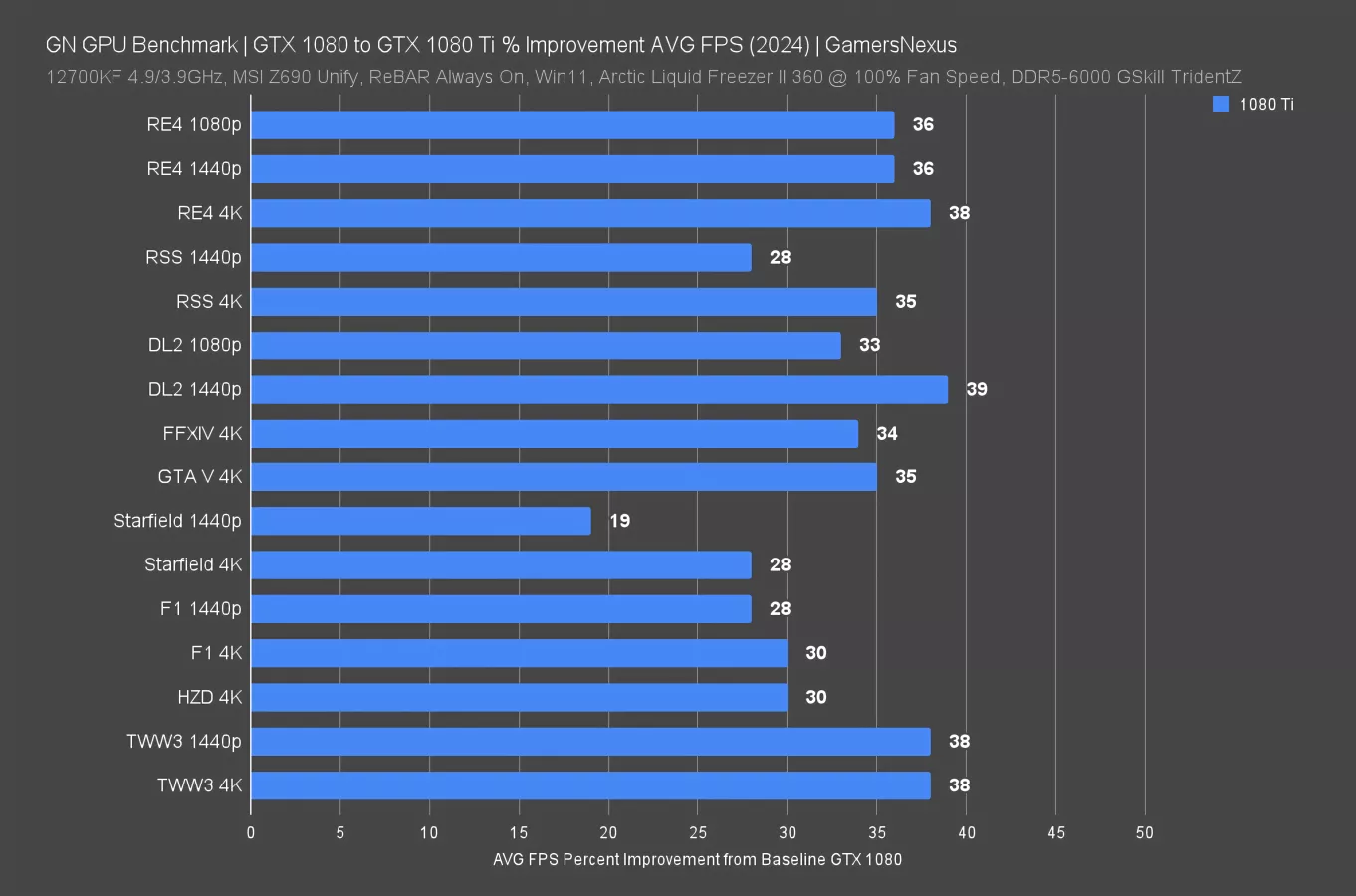 Here’s the chart. This shows the percent improvement from a GTX 1080 to a GTX 1080 Ti in various games we test in 2024. It’s remarkably consistent from game-to-game in this era, even across resolutions. That’s a big difference from what we see between the cards today, where NVIDIA plays with memory bandwidth in ways that create less predictable scaling across resolutions.