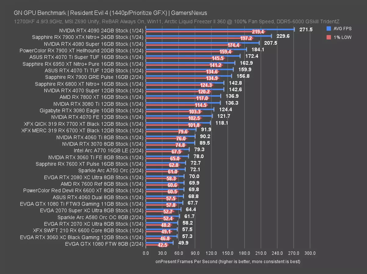 At 1440p, the GTX 1080 still holds 130 FPS AVG in Rainbow Six Siege, with the GTX 1080 Ti continuing to impress and earn its GOAT title, all 7 years later, with a performance equivalent to the 2070 Super and besting the modern A750 (read our revisit here). Noteworthy entries on this one remain the RTX 3080, which would still give a huge upgrade pathway while potentially running cheap if you’re willing to trust a used listing. The new RX 7900 GRE also jaunts ahead for something at a balanced price.