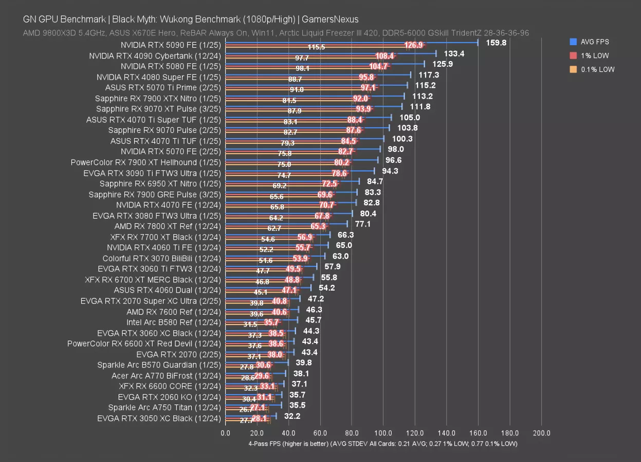 The RTX 5070 crushes the 9070 here, holding a 57% lead over the AMD GPU. The 5070 Ti’s scaling over the 9070 XT was better and nearly 80%, but 57% is still huge for the 5070 over the 9070. If you want to play Black Myth with ray tracing, like we said in the 9070 XT review, you basically only buy NVIDIA.