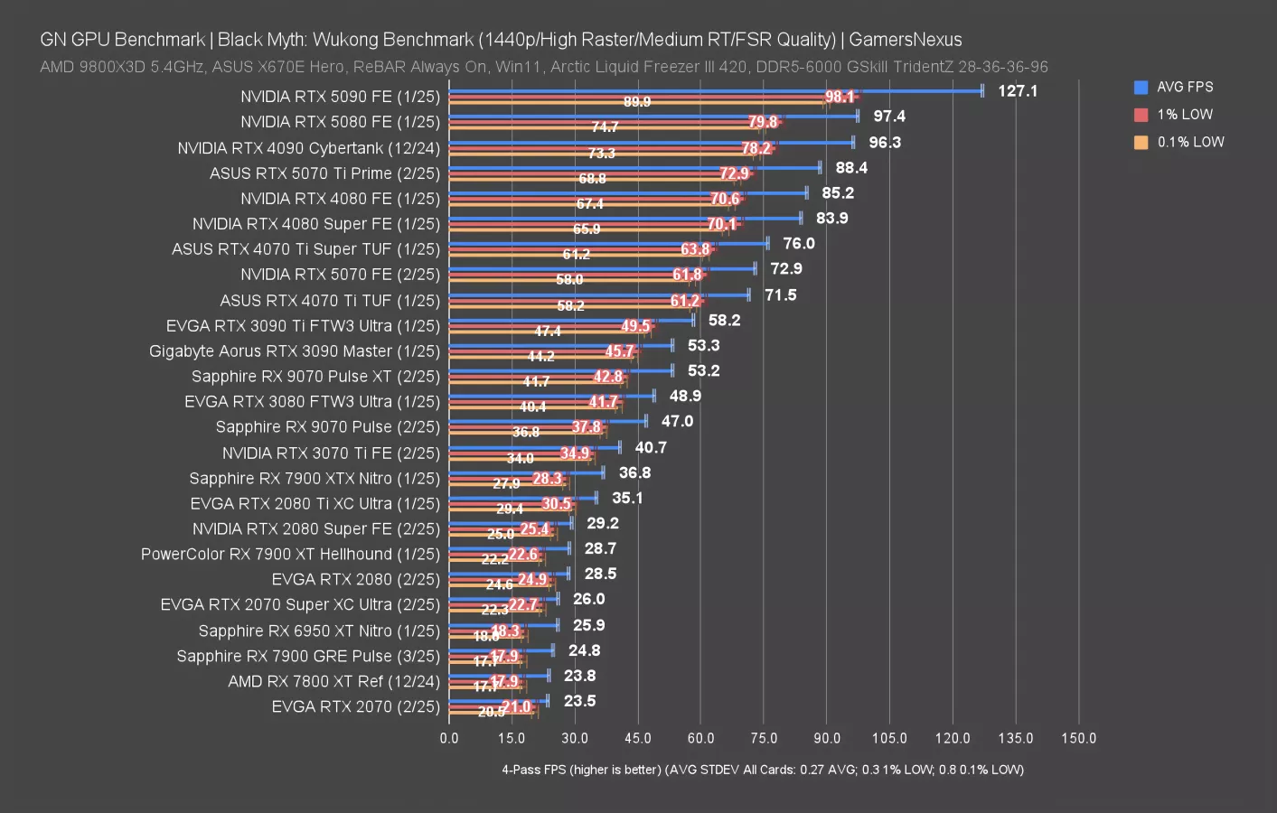 At 1440p, the RX 9070 ran at 96 FPS AVG and nearly tied the 4070 Ti Super again. The 5070 Ti outperforms the 9070 by a lame 5.4%, with the 9070 XT outperforming the 9070 by 10%.