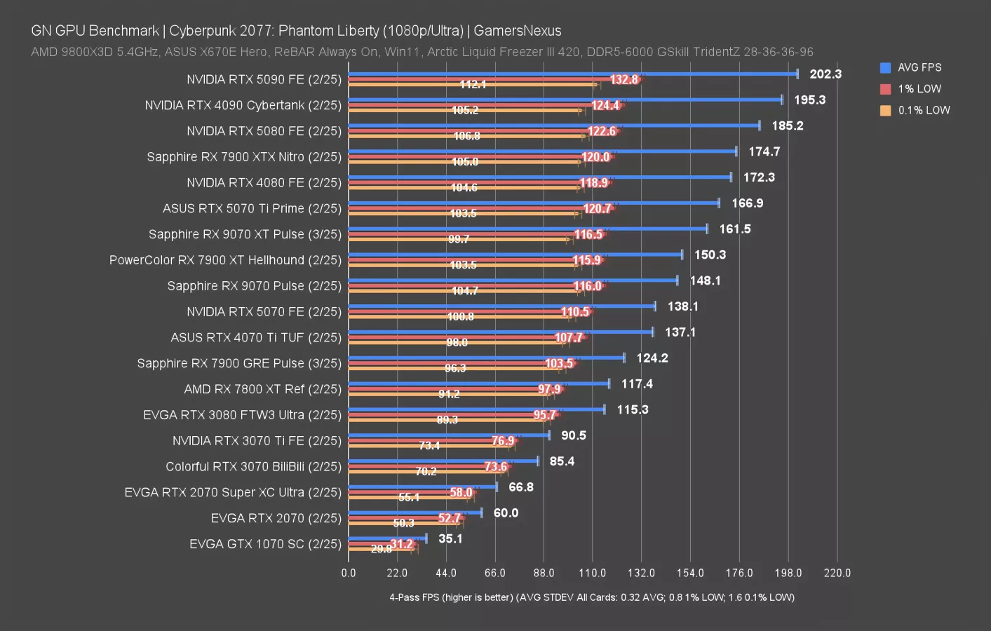 In Phantom Liberty at 1080p now, the 9070 landed at 148 FPS AVG, allowing the 7900 XT (watch our review) to maintain its slight lead. The improvement in the 9070 over the 5070 is now down to 7% from 15% at 4K originally. If we dropped it down to 360p, based on this trend, NVIDIA might actually pull ahead. Great. Just like they’ve wanted -- maybe that’s the push for DLSS.