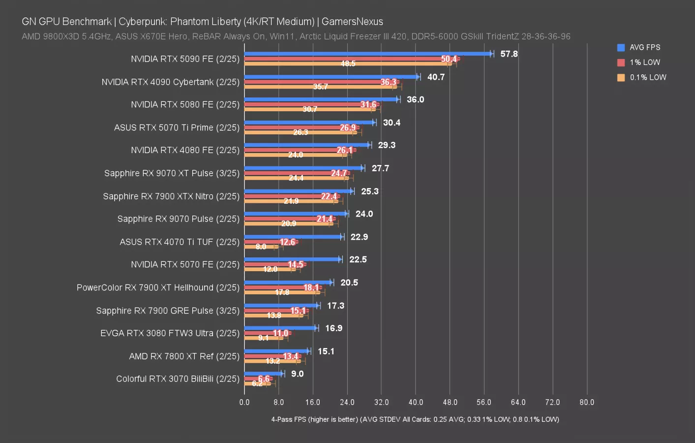 Against the 5070’s 83 FPS AVG, the 9070 leads by 15%. If the 5070 weren’t already in the grave, we’d pronounce its impending demise. We might want the 9070 to be a bit cheaper just to see that balance for the times it loses or is tied, but even without that, we can’t deny that AMD is putting up its best fight against NVIDIA in years.