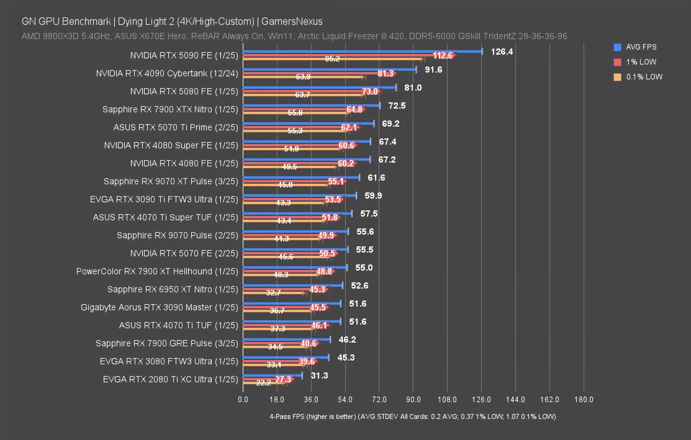 In Dying Light 2 at 4K, the RX 9070 ran at 56 FPS AVG and kept lows remarkably close by, at 50 and 41 -- but not in any more remarkable way than all of its neighbors. This game is just consistent.