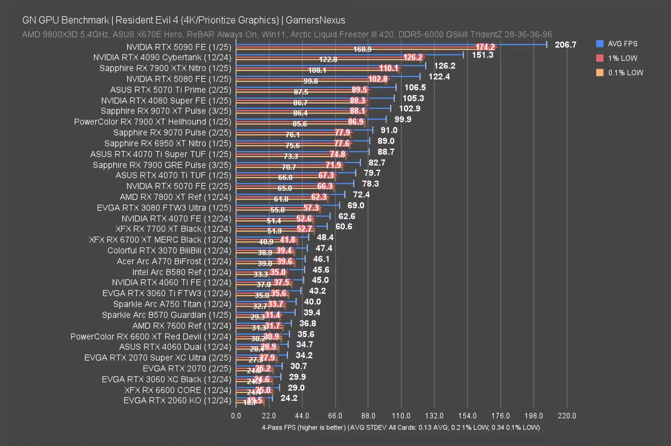In Resident Evil 4 with ray tracing and at 4K upscaled, the 9070 held a 104 FPS AVG and outperformed the 4070 Ti Super and 5070. The boost over the 5070 is 14% here. The 9070 XT ran 12% higher framerate than the non-XT, with the 5070 Ti basically tied with that.