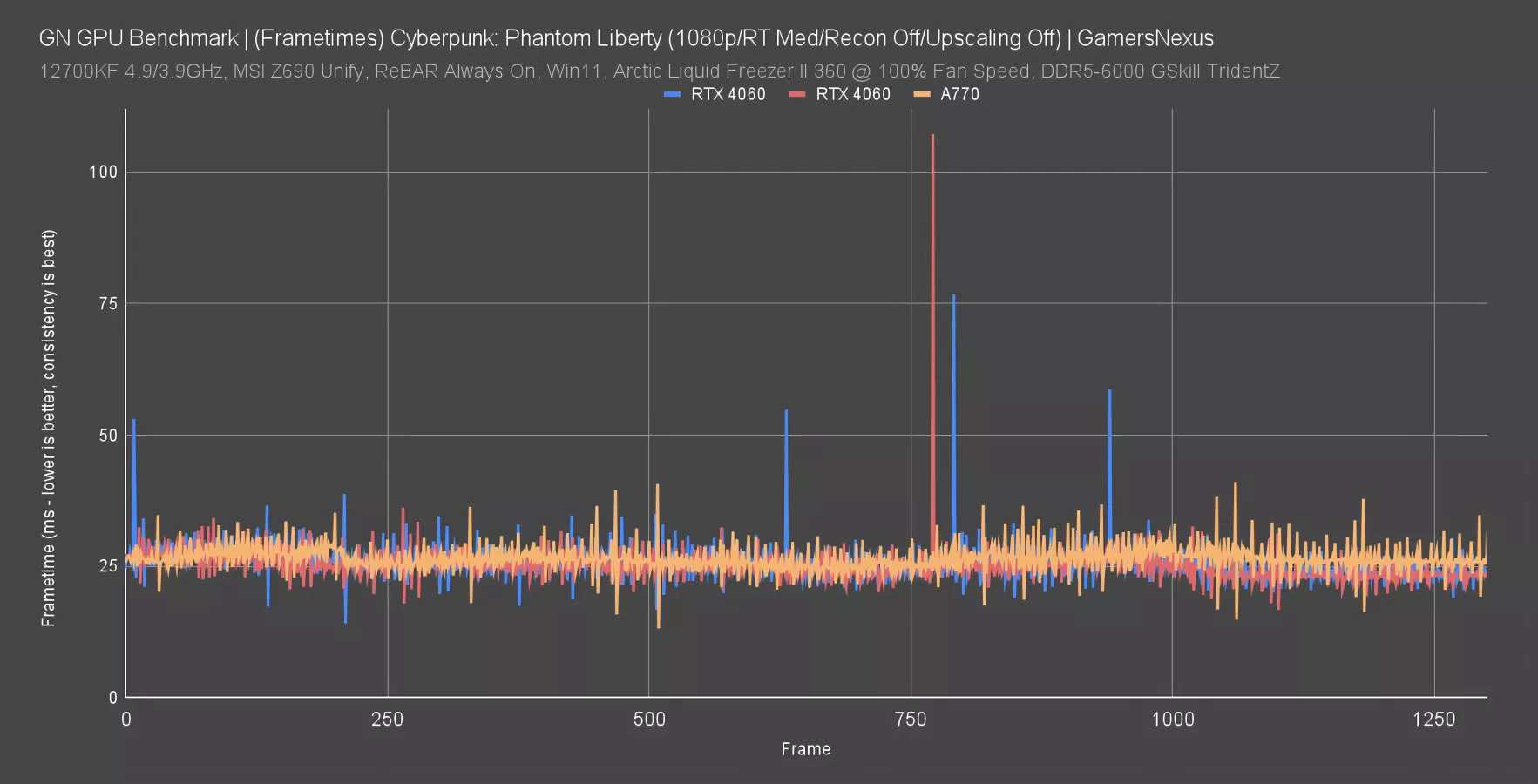 The A770 is much more consistent and lacks any of these massive spikes. That’s how 0.1% lows are supposed to be used: They’re an indicator to point us toward a problem, and here, the problem is the 4060’s ability to consistently deliver well-timed frames.