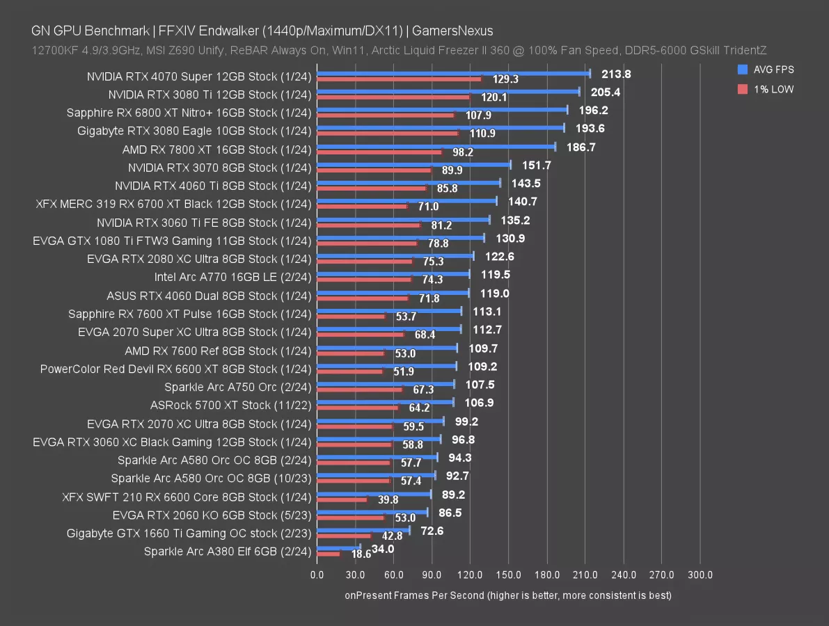 We’re including 1440p because it reinforces an earlier point: The A770 is able to gain ground on the RTX 4060 here, which has its lead reduced from 15% in the 1080p chart to just 1.3%. The resolution bump is hard for the 4060 and 4060 Ti cards to handle at scale.