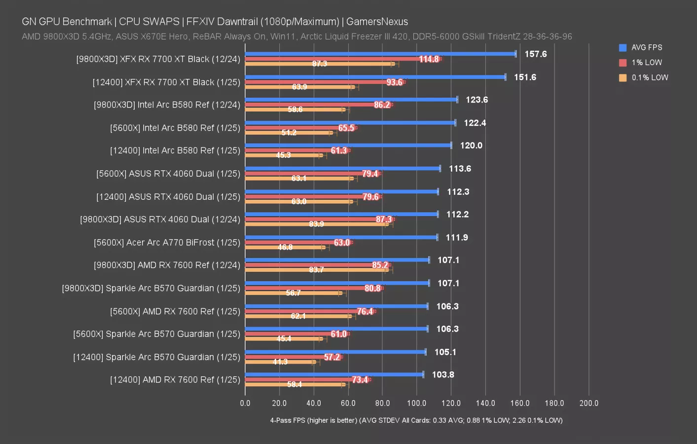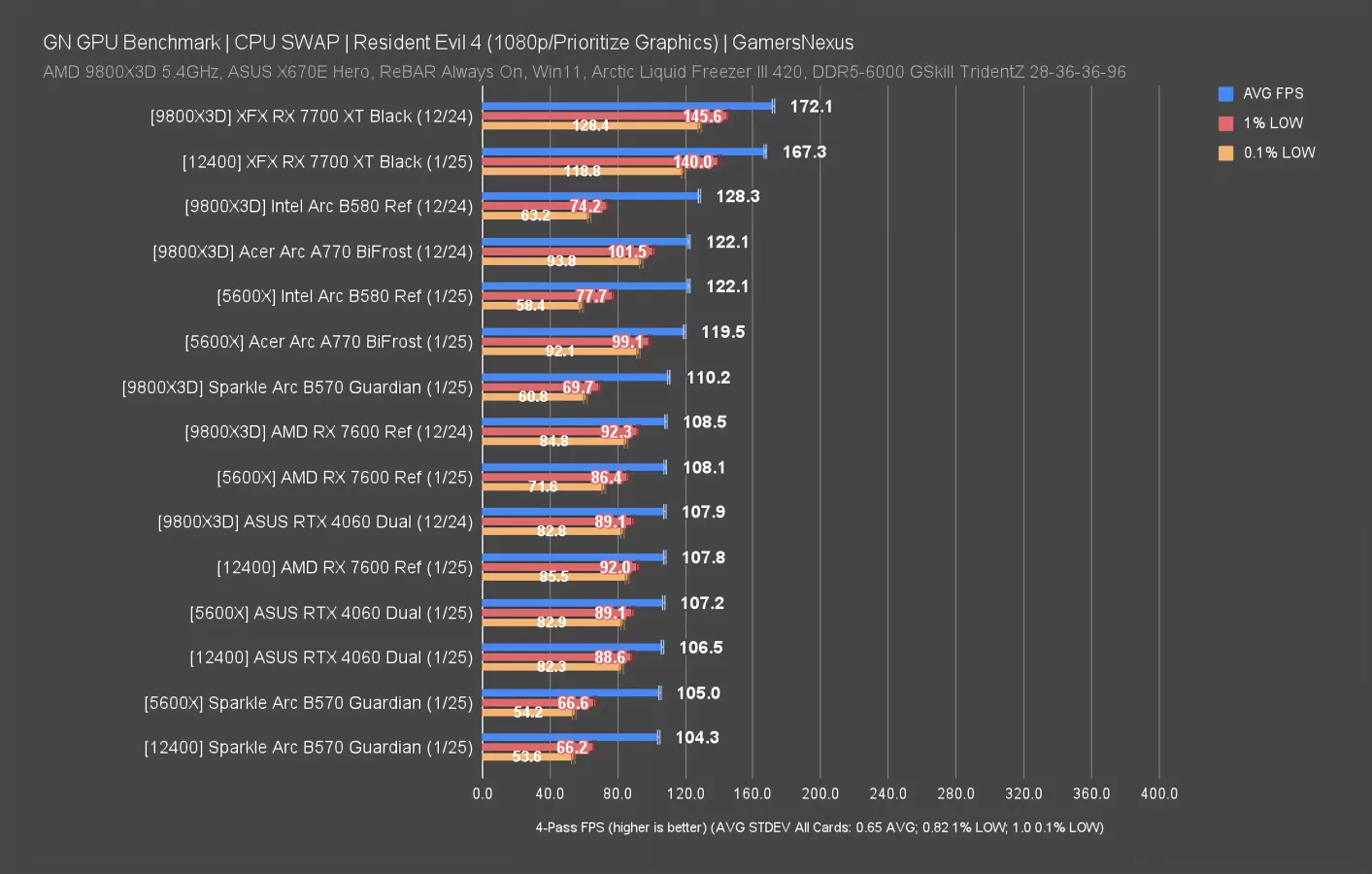 The numbers do not change in any meaningful way. The 7700 XT is the same on both, the 4060 is the same on all 3, the 7600 is the same on all 3 (with the exception of reduced lows on the 12400), the B580 is the same on all 3 and lows are within variance run-to-run. The B570 is the same on all 3, with lows within the wider variance at the low-end. The A770 is the same on both.