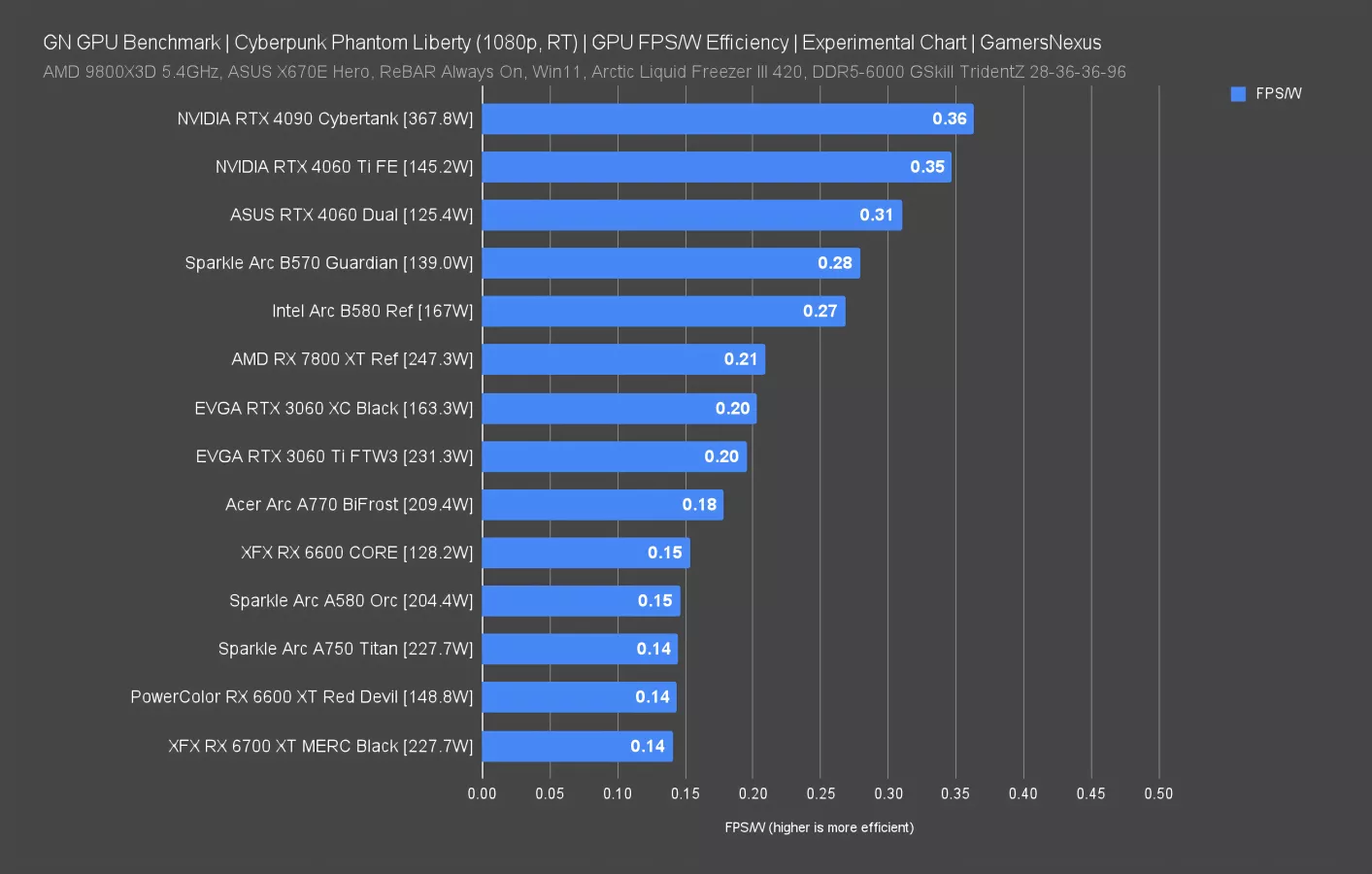 Cyberpunk is the last one. This is a pretty good showing for Intel: The B570 isn’t tied with the RTX 4060, but it’s getting a lot closer. The 0.28 FPS/W result is far improved over the 7800 XT and puts it in 4th of the devices tested so far. Note that the 4090 (watch our review) looks inefficient here as it is becoming bound by other components at this resolution.