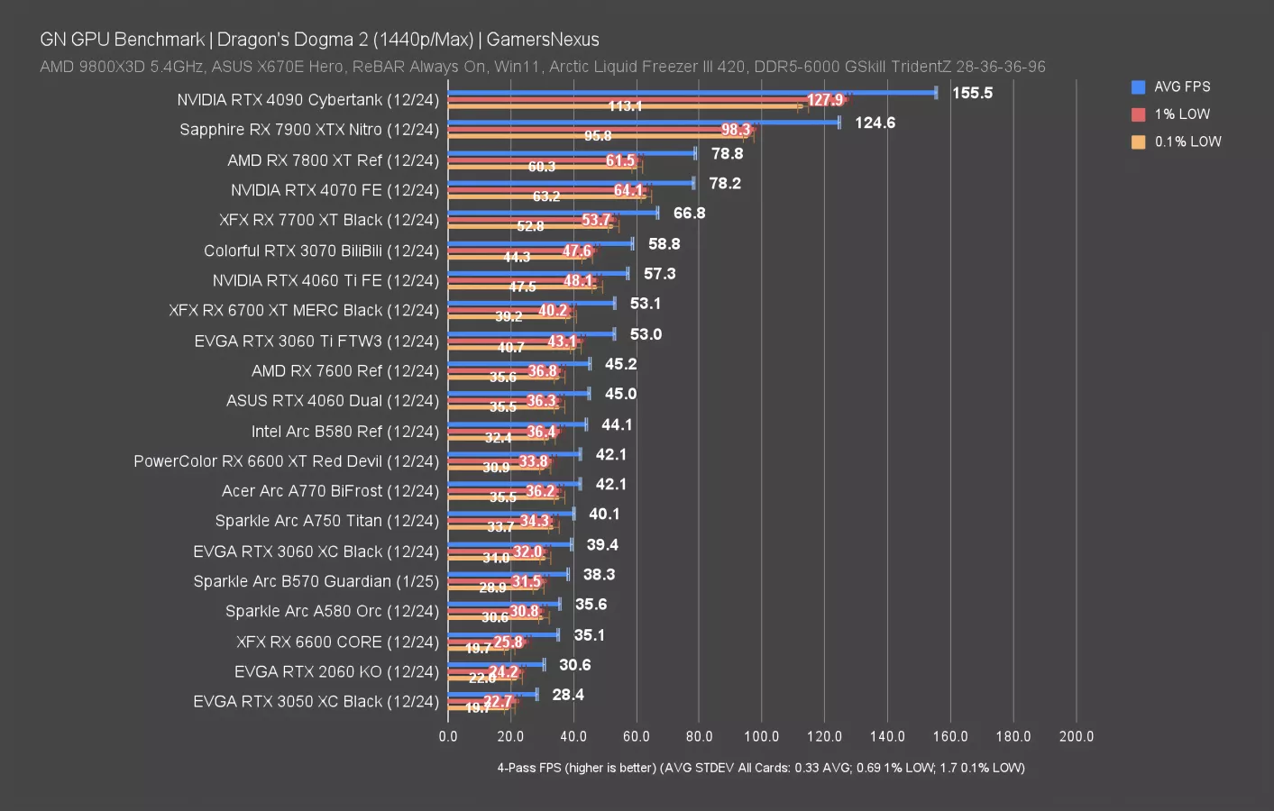 Dragon’s Dogma 2 is up next, first at 1440p/Max without RT. In this test, the B580 sticks to a 15% lead over the B570, so that’s consistent. The RTX 4060 leads the B580 and the B570 alike, with the RX 7600 about tied with the RTX 4060 and within run-to-run variance. The B570 is not particularly strong here. It’s about the same as the 3060 and outperforms the RX 6600. The price is noteworthy, although the B580 is overall more competitive in raw performance. In the least, lows are comparable in this test to non-Intel parts.