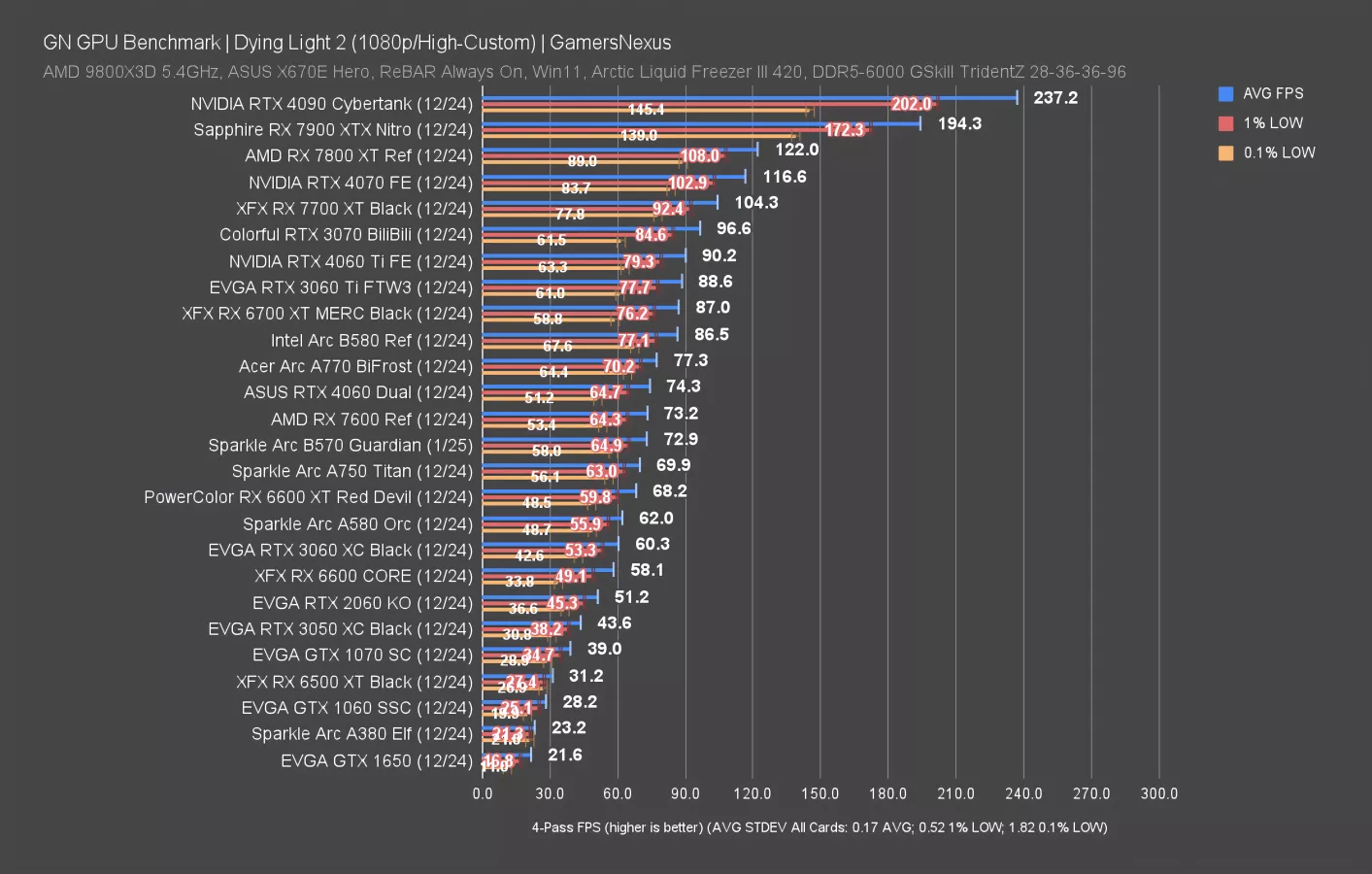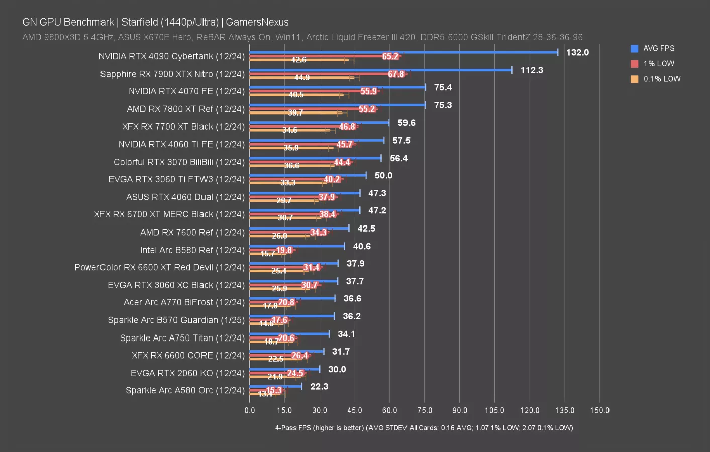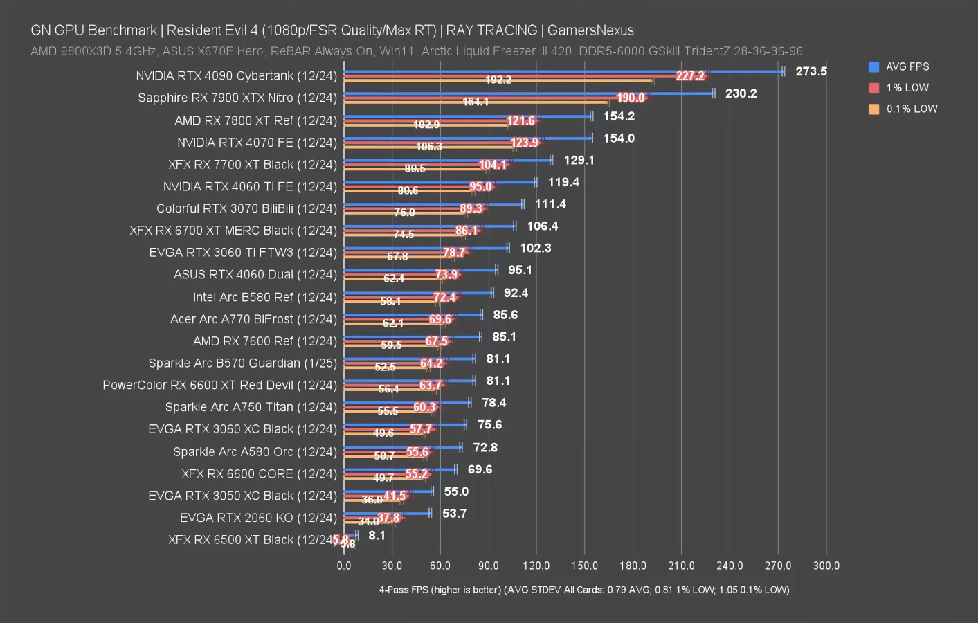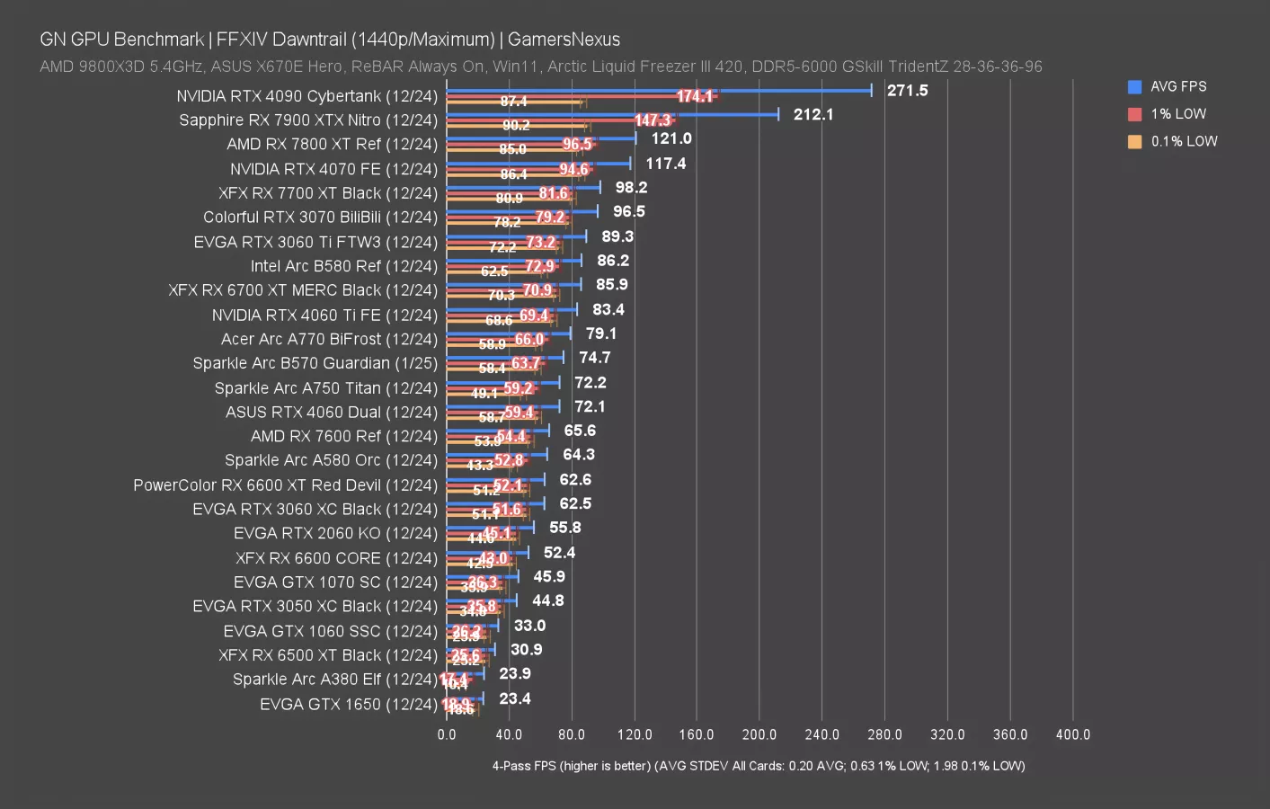 The B580 keeps its 16% lead over the B570 in this test, with both outdoing the RTX 4060. The RTX 4060 Ti even struggles in this, also suffering from inconsistent run-to-run variance and low performance for 0.1%. AMD has problems of its own, mostly just that it’s unable to compete in this test. The RX 7600 is down under 30 FPS AVG. At this price point, Battlemage is actually the best in this specific test and setup.