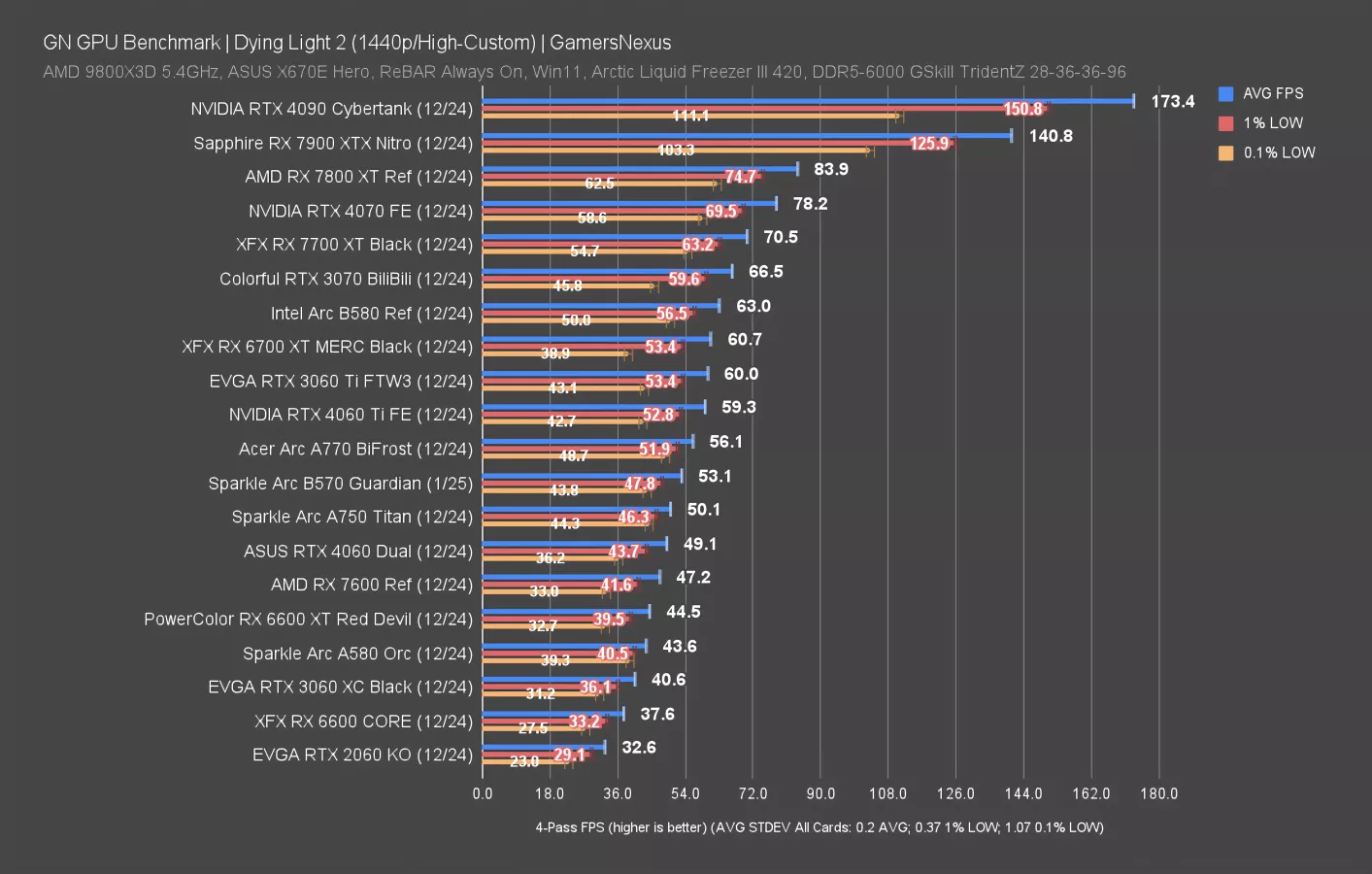 At 1080p, the B570 GPU ran at 47 FPS AVG, planting it between the A770 of last-gen and the RX 6600 XT. Against Alchemist, it’s clear that Battlemage is a huge improvement when considering the configuration size of the A770 GPU against the B570 GPU. Against itself, Intel has definitely improved in huge ways. Against competition, the RTX 4060 and RX 7600 both hold advantages at both the resolution and with the game.