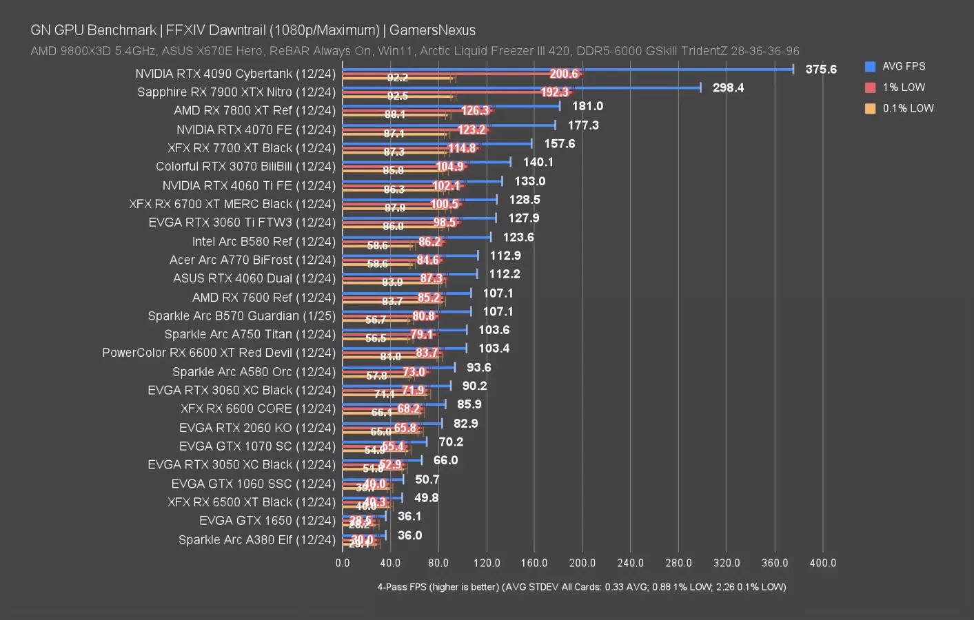 The RTX 4060 ran at 107.9 FPS AVG on the 9800X3D and 106.5 FPS AVG on the 12400. The RTX 4060 shows a top-to-bottom range of 1.3%, smaller than the observed difference on the B570. This slightly reconstructs the stack such that the B570 ends up tied or slightly under the RTX 4060 rather than ahead of it by 2.1%; however, the reduction puts the RTX 4060 on like-for-like hardware maximally 2% ahead. Between the two, they’re realistically about the same.