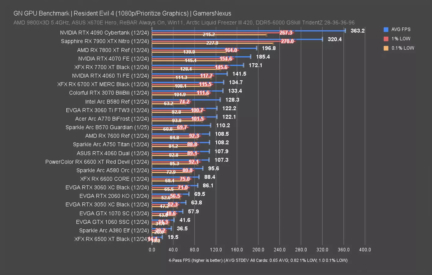 Resident Evil 4 at 4K was one of the B580’s strongest titles. In this test, the B580 marginally outperformed the RTX 4060 Ti (watch our review) in averages, with the 0.1% lows close enough to be comparable given wider margins. The B580 at 46 FPS AVG leads the B570’s 40 FPS AVG by about 16%, aligning with some of the other 4K results. The B570 ends up outperforming the RX 7600 by 7% and the RTX 4060 by 14%, which is an incredible lead for the B570 when fully GPU-bound. Considering the RTX 4060’s price, this is a big lead for Intel.