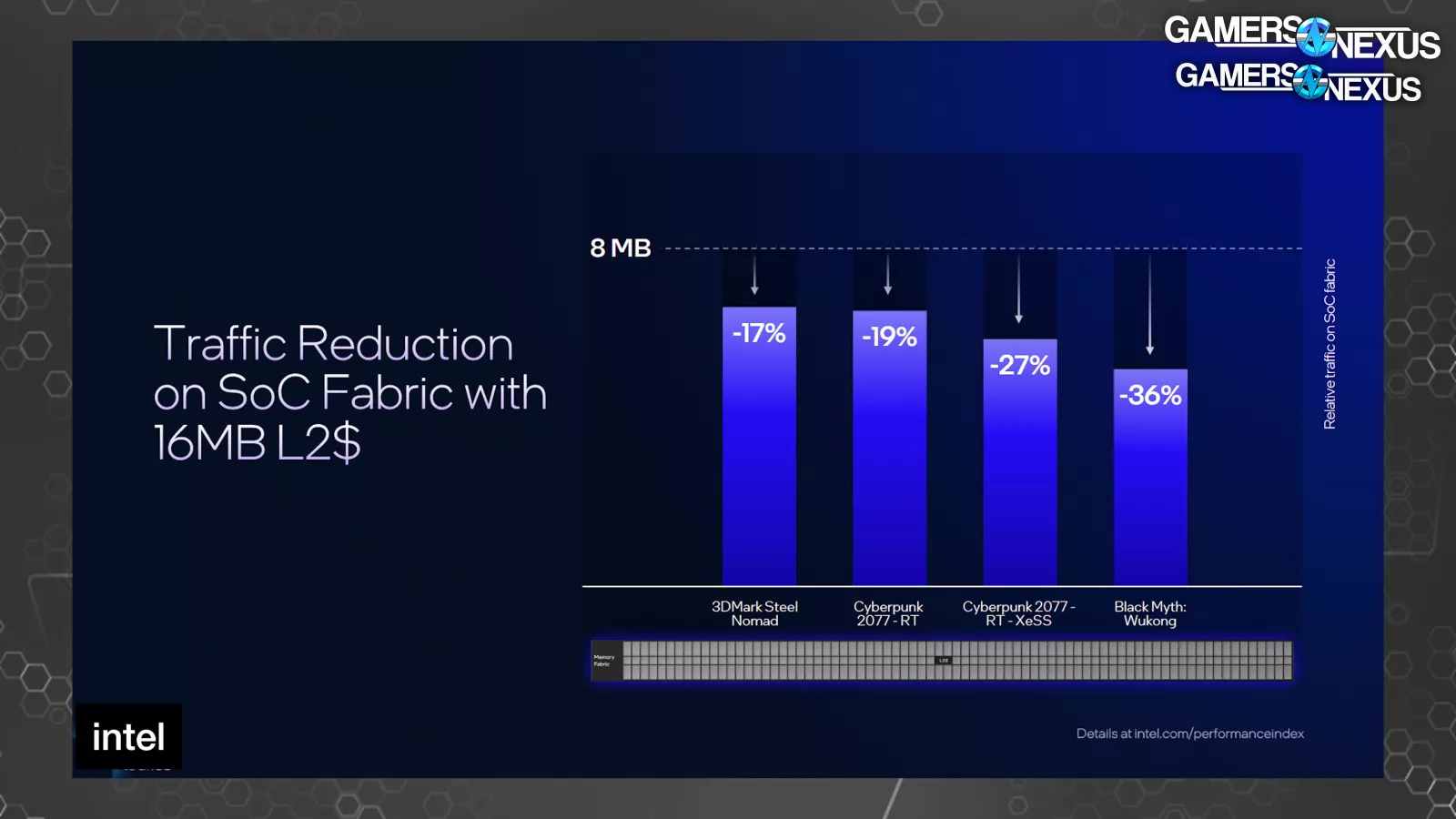 Looking at Intel’s first-party results, it presents the improvement in the form of relative traffic on the SoC fabric (in the vertical axis) against a baseline 8MB L2 cache. Cyberpunk with RT showed a 19% reduction, Black Myth rasterized showed a 36% reduction, and the rasterized Steel Nomad test showed a 17% reduction.
