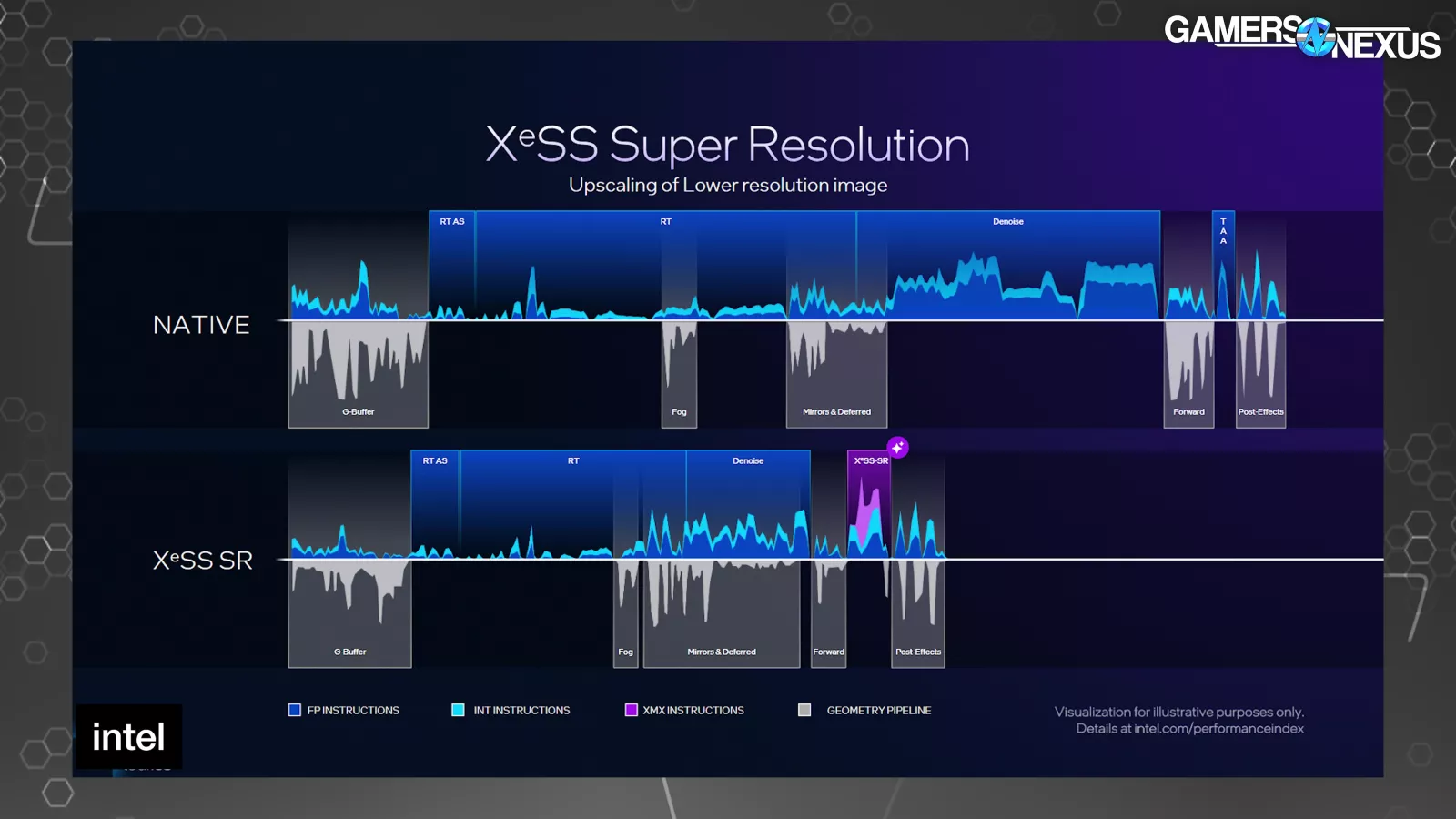Intel presented a few timelines of a single frame. One at native, and then several with various levels of XeSS technology in use. The shorter the duration that the frame is on the X-axis, the less time the frame took to complete. The top half of each shows instructions and the bottom half shows when the geometry pipeline is active.