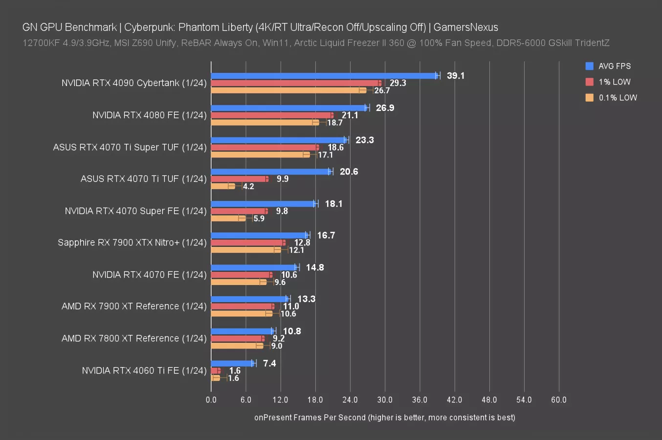 The 4070 Ti Super puts pressure on AMD’s 7900 XT. If you care a lot about super heavy ray tracing, like ultra or high settings in games like Cyberpunk and Alan Wake, then the 7900 XT falls behind in big ways. If you don’t care about RT or you play less RT-intensive titles, like games with a single RT feature, then the 7900 XT and 4070 Ti Super are less different.